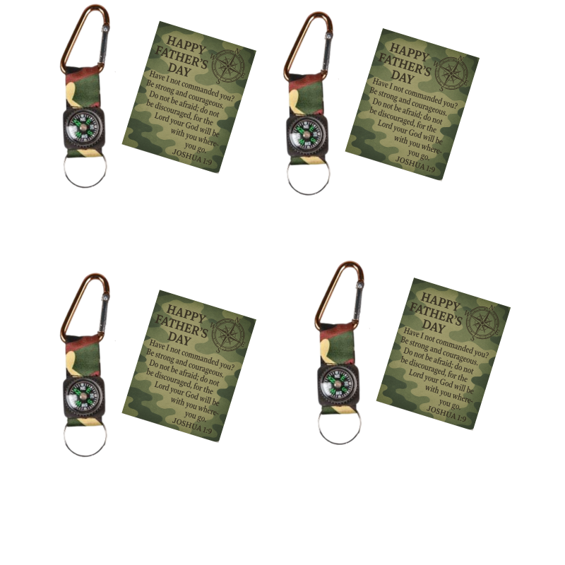 Celebrate the courage and strength of godly fathers with this 12-pack of military-style compass keychains, each paired with a bold, camo-themed Father’s Day card featuring Joshua 1:9.