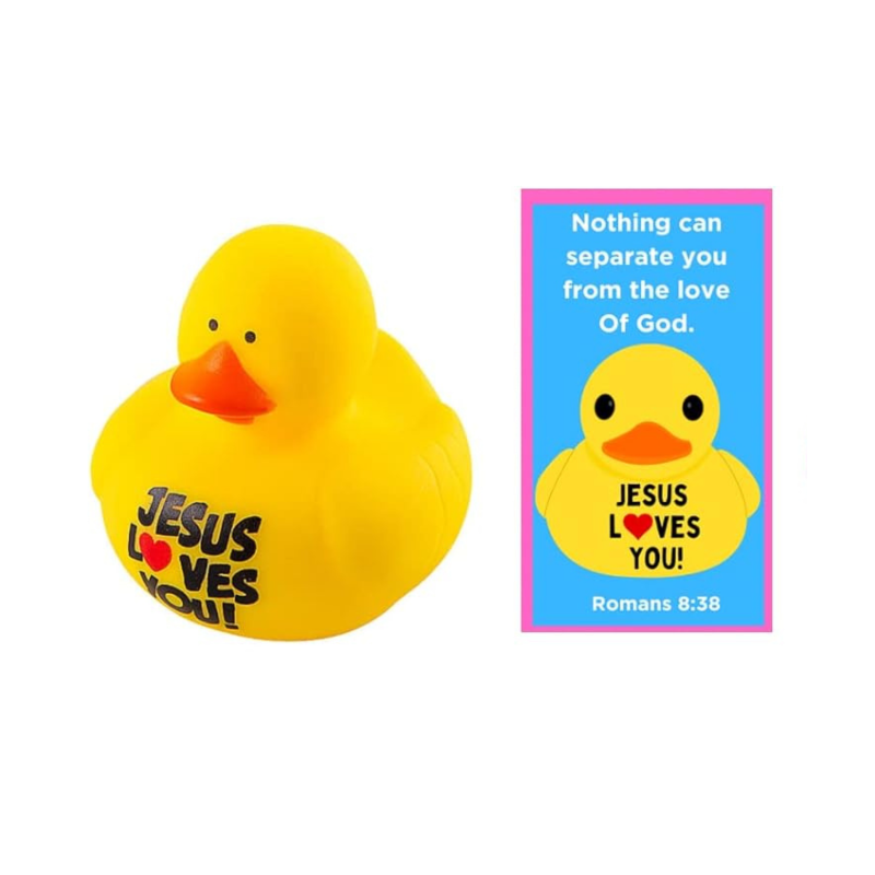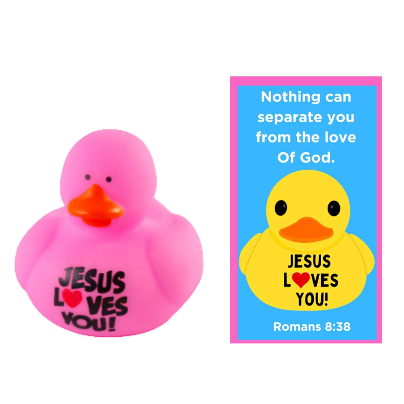 Bring joy and inspiration to your next church event, Sunday school class, or VBS with these Jesus Loves You Pocket Prayer Bookmark and Rubber Duckie Sets. Each set includes a 2-inch vinyl duck with the uplifting message 'Jesus loves you' printed on it, along with a matching prayer card bookmark measuring 3.5' x 2'. These durable and colorful ducks are perfect for spreading smiles and reminding others of God's unshakable love, as inspired by Romans 8:38. You get 4 or each of the colors shown for a total of 12.