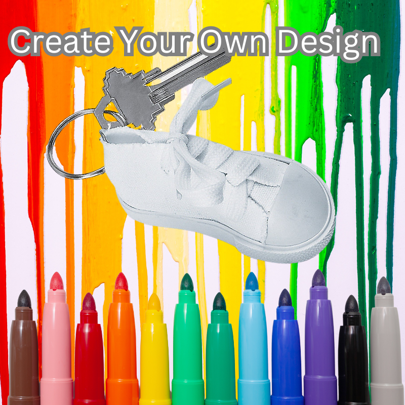 White Tennis Shoe Keychain, a fantastic choice for party favors! Whether you prefer them in their classic white finish or want to unleash your inner artist with a splash of color, these 3' keychains are sure to delight. Each one comes complete with a durable metal key ring for your convenience.