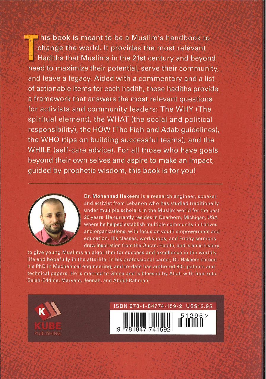 This book is meant to be a Muslim’s handbook to change the world. It provides the most relevant Hadiths that Muslims in the 21st century and beyond need to maximize their potential, serve their community, and leave a legacy. Aided with a commentary and a list of actionable items for each hadith, these hadiths provide a framework that answers the most relevant questions for activists and community leaders: The WHY (The spiritual element), the WHAT (the social and political responsibility), the HOW (The Fiqh and Adab guidelines), the WHO (tips on building successful teams), and the WHILE (self-care advice). For all those who have goals beyond their own selves and aspire to make an impact, guided by prophetic wisdom, this book is for you!