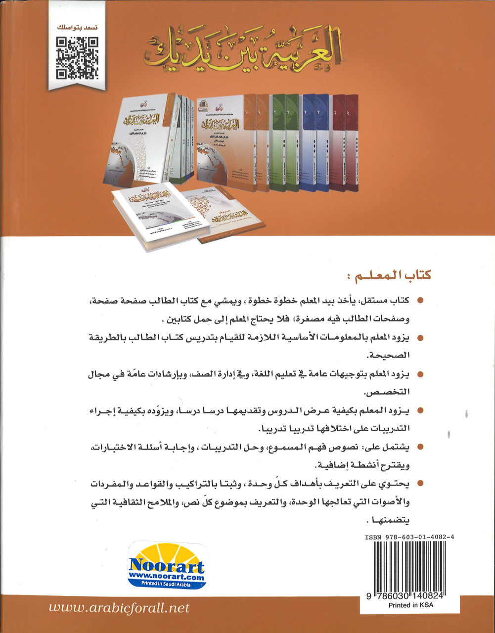 Arabic Between Your Hands Series is one program in a collection of programs called “Arabic For All.” This series comprises a developed version of the book “Arabic At Your Hands,” which introduces a comprehensive curriculum for teaching Arabic for non-Arabic speakers, students and teachers. This curriculum is developed for educational entities, including schools, institutes and universities. It begins from the basic level and continues with the students until they master Arabic language, which enables them to join university and continue their Arabic studies in various majors. The developed series is designed by the authors of the original series, who are an academic team specialized in teaching Arabic for non-Arabic speakers. Teacher’s books are identical to student’s book and aim at providing the teacher with a collection of techniques and procedures to help him teach every page in student’s book effectively in a way that achieves the best results.