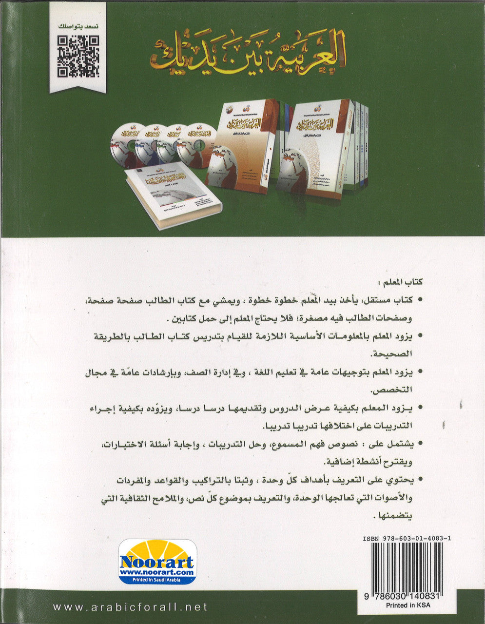 Arabic Between Your Hands Series is one program in a collection of programs called “Arabic For All.” This series comprises a developed version of the book “Arabic At Your Hands,” which introduces a comprehensive curriculum for teaching Arabic for non-Arabic speakers, students and teachers. This curriculum is developed for educational entities, including schools, institutes and universities. It begins from the basic level and continues with the students until they master Arabic language, which enables them to join university and continue their Arabic studies in various majors. The developed series is designed by the authors of the original series, who are an academic team specialized in teaching Arabic for non-Arabic speakers. Teacher’s books are identical to student’s book and aim at providing the teacher with a collection of techniques and procedures to help him teach every page in student’s book effectively in a way that achieves the best results.