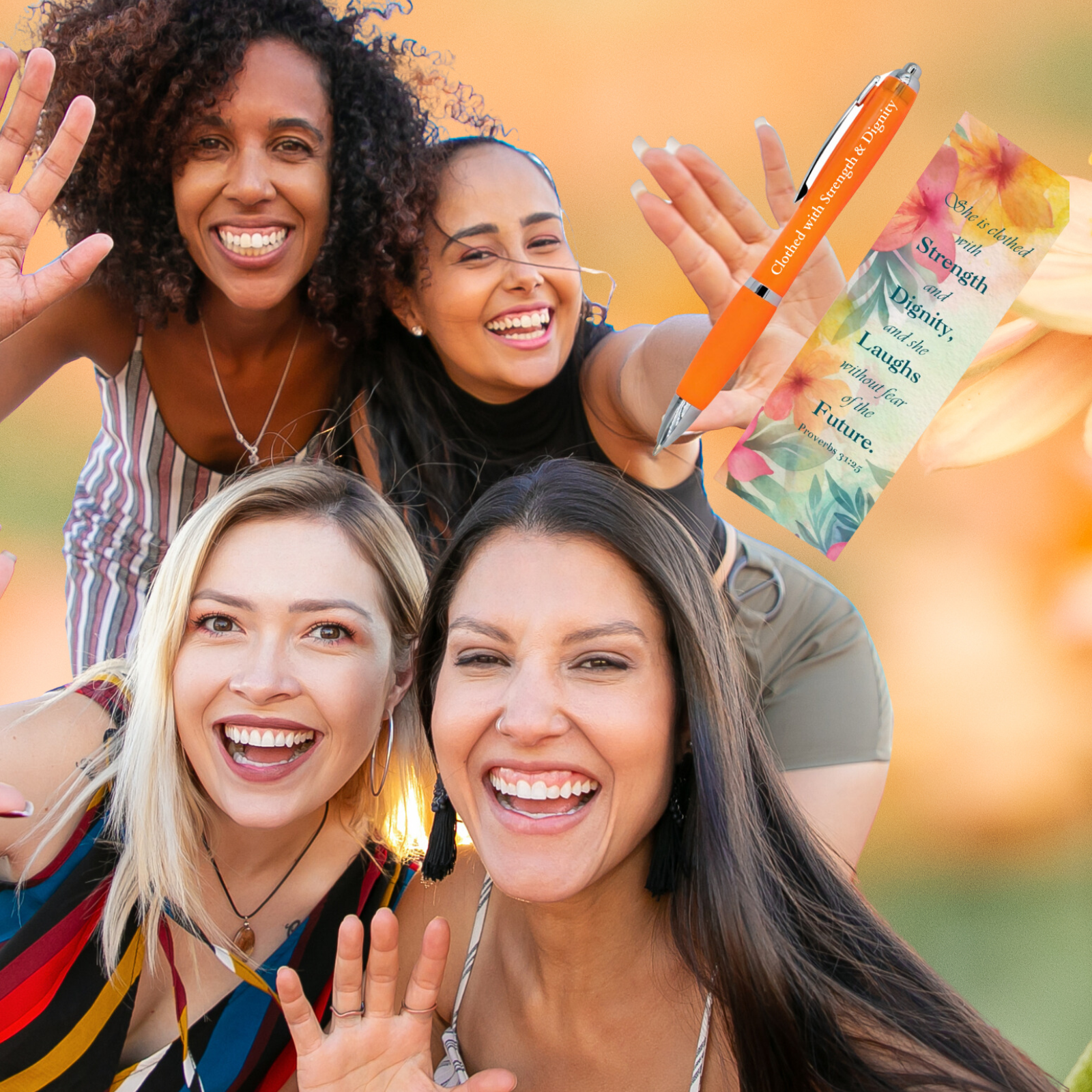 These bulk set of 10 “She is Clothed with Strength and Dignity” pen and bookmark gift sets seamlessly blend faith, elegance, and inspiration. Within each set, you’ll discover ten pens, each adorned with the empowering phrase “Clothed with Strength and Dignity.” These sleek pens not only provide a comfortable writing experience but also carry the timeless wisdom of Proverbs 31:25 on their reverse side. Accompanying the pens are exquisite watercolor flower bookmarks, measuring a generous six inches. These bookmarks echo the same message of inner strength and grace: “She is Clothed with Strength and Dignity”, along with the powerful reminder that she laughs without fear of the future. Whether gifted during women’s retreats, shared within ministries, or presented as thoughtful Mother’s Day tokens, these sets serve as daily reminders of resilience and faith. Share the message of strength and dignity with the remarkable women in your life—they deserve nothing less.