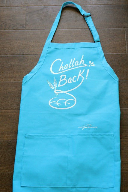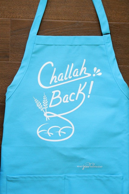 Challah Back, y'all! A great gift for a friend or yourself! Based on the popular recipes on the blog 'What Jew Wanna Eat'. Turquoise with fun Challah Back design. Hand drawn and screen printed in Austin, TX. Great for beginning cooks, experts or as a hostess present for the holidays! Jew don't have to be Jewish to enjoy this punny apron!