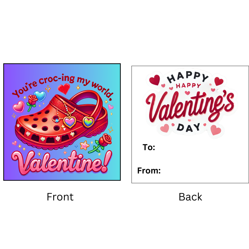 Surprise your loved ones with this delightful set of 12 customizable clog shoe keychains, perfect for Valentine's Day! Each keychain features a charming white clog shoe design with perforated details, allowing you to add your own personal touch. Accompanying the keychains are festive Valentine's Day exchange cards adorned with a vibrant illustration of a red croc shoe surrounded by hearts, roses, and playful graphics. These keychains make wonderful small gifts or party favors to spread joy and celebrate the season of love. Measuring approximately 3 inches in length, they are compact yet eye-catching accessories. Craft a heartfelt message on the exchange cards and share these delightful keepsakes with your special someone, friends, or family members.