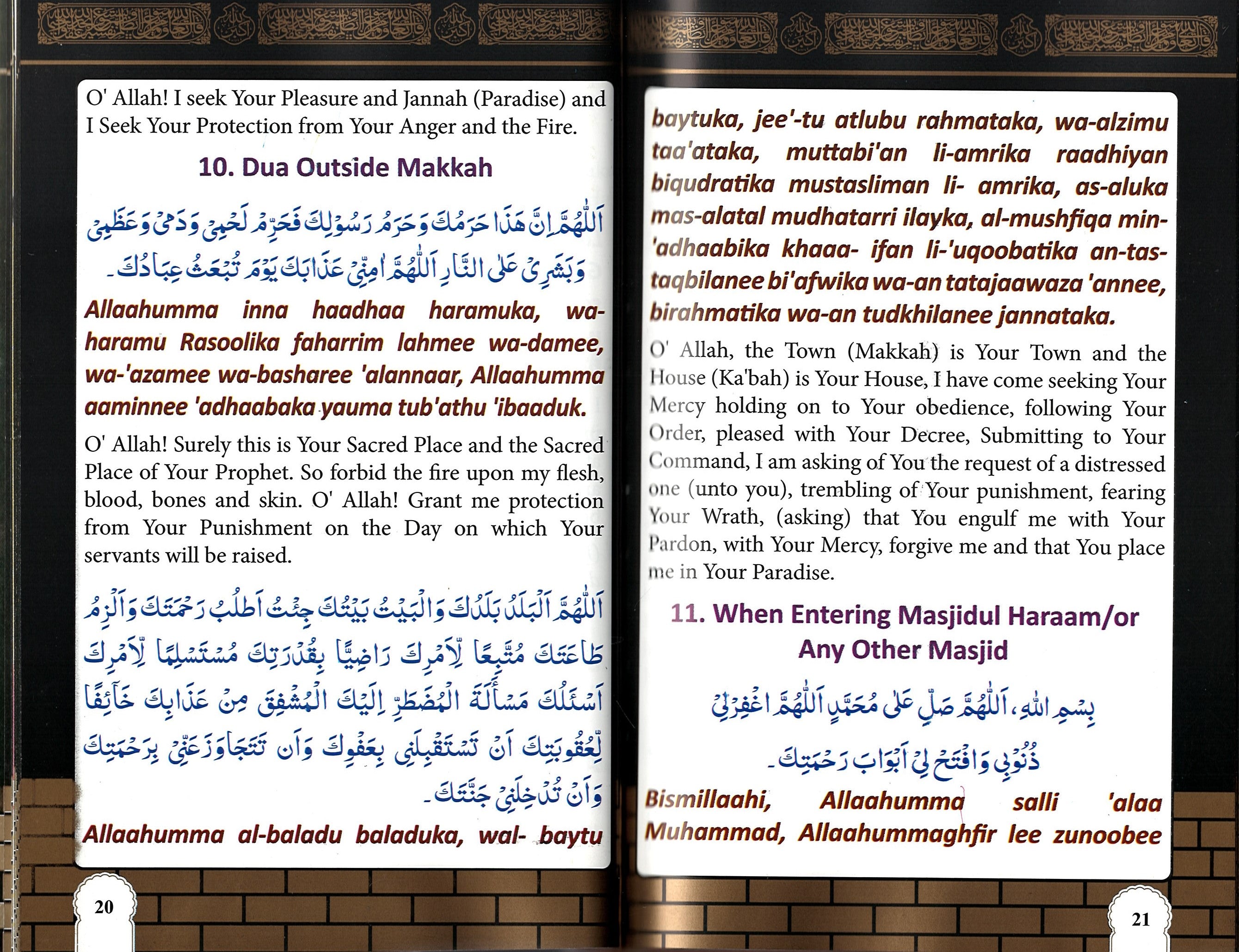 This book is a collection of prayers (duas) to be said while at the Haramain for Hajj and Umrah. It incorporates all essential duas right from when you step out of your house, during your travel, until you get back home. These include duas to be recited when in a state of Ihram, when you happen to see the Kaaba, while performing Tawaf, Arfa, while at Mina, on entry into Madina and so on.