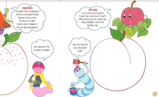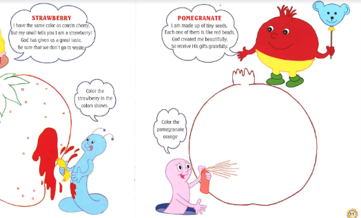 Each drawing in the Learn & Color Series is associated with an introductory text that describes the object in rhyming words. Darling Animals includes drawings of animals like birds, cats, horses, giraffes, etc., Delicious Fruits invites children to colour various fruits while describing their tasty features. Nutritious Vegetables has a dual purpose of making vegetables enjoyable both for colouring and eating. My Wonderful Body talks about body parts along with their functions and purposes. All descriptions in the books seek to show how God made everything useful, functional and beautiful.