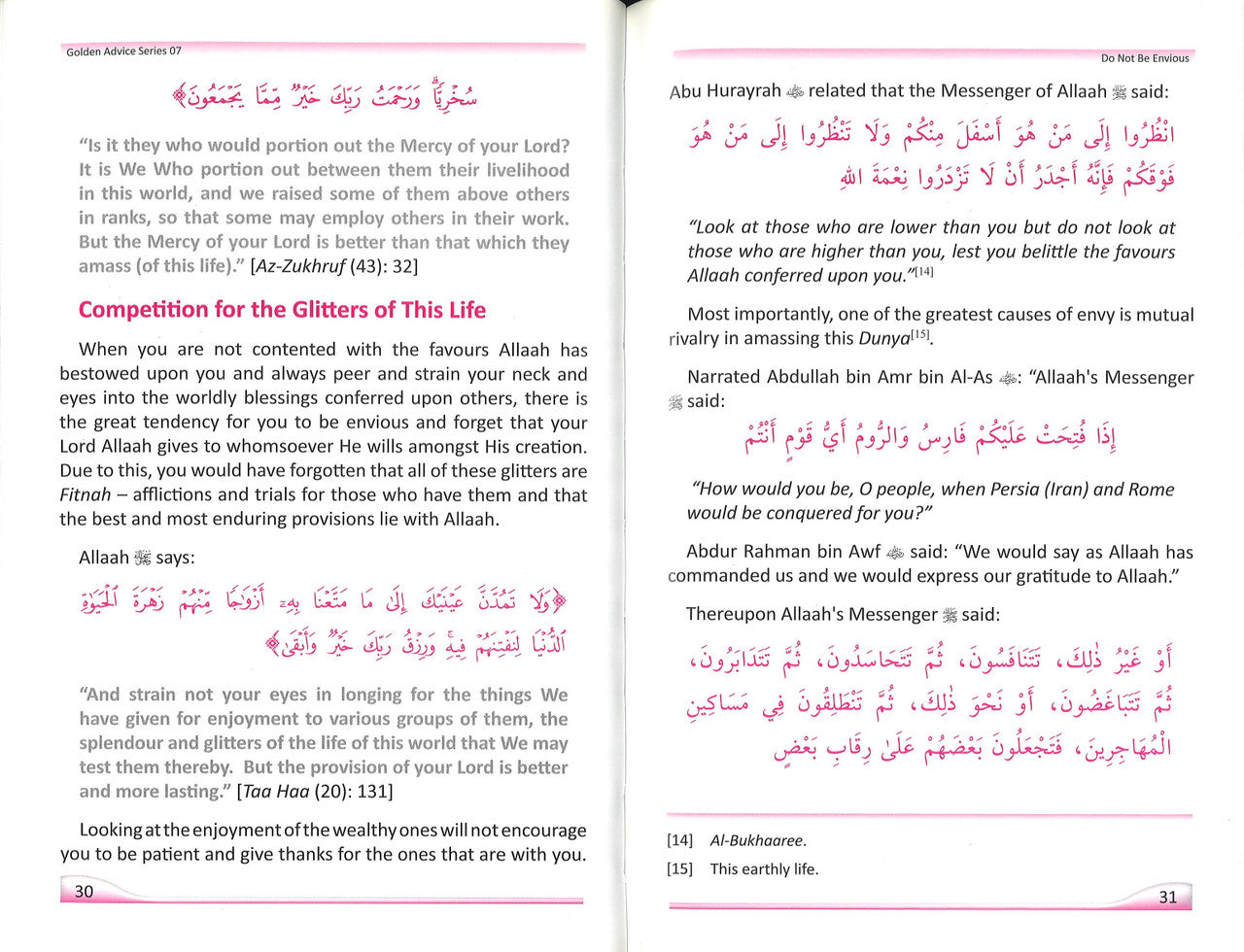 Ever heard of the cause of the first disobedience in the heavens? ENVY! That was it! Ibleess (Shaytaan) disobeyed Allah, his Lord, out of envy, arrogance, and pride. (See Al-Araaf [7]: 12). Envy is also one of the commonest sins on earth! It is the deadly disease of the heart that destroys personal as well as communal relationships! ENVY: its causes, its effects and how to deal with it, is the subject of this small but beneficial book. May the one who is afflicted with this disease fine cure in the prescription contained in this book. (Ameen)