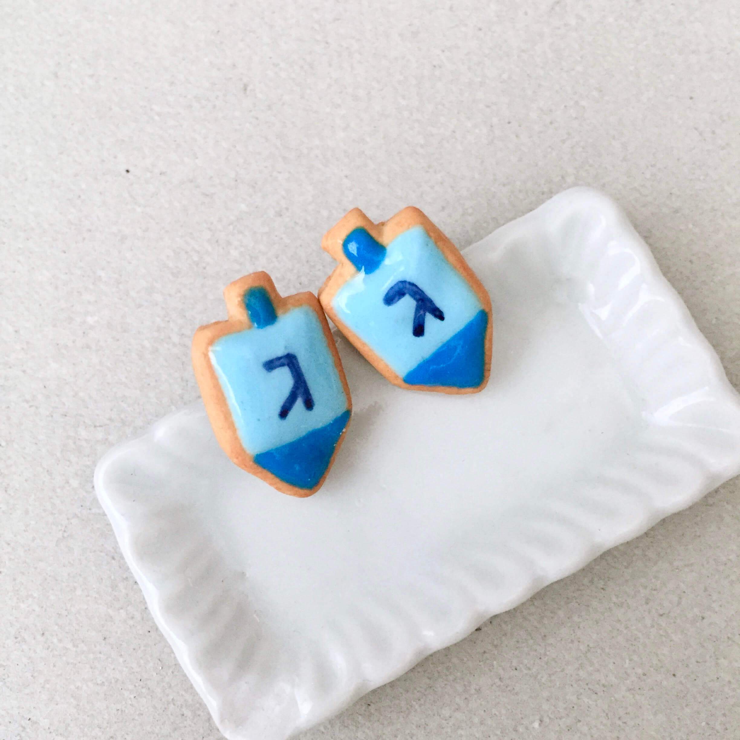Little dreidel cookies are hand-sculpted from polymer clay and feature realistic details like baked edges, frosting, and the letter “gimmel'.