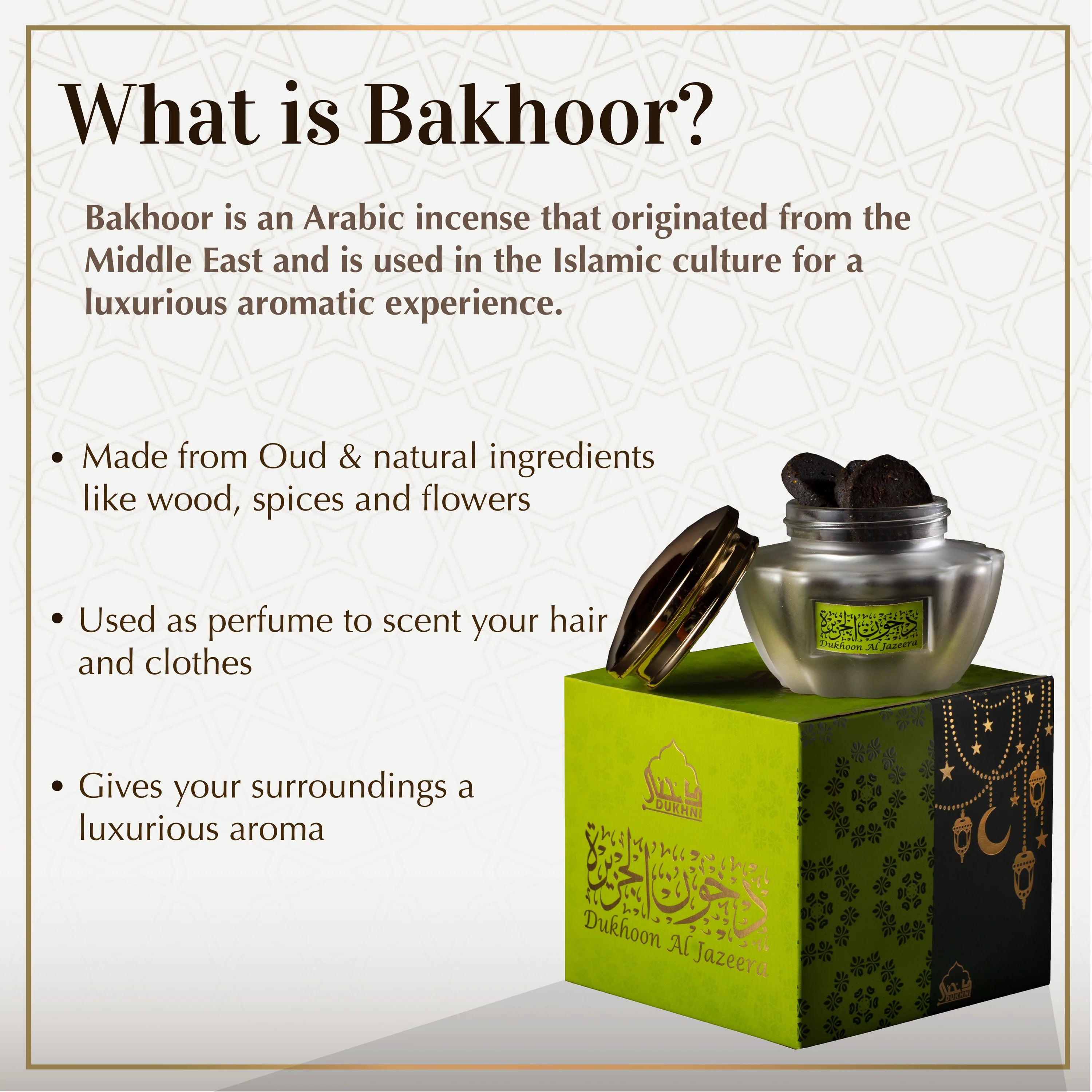 What makes Dukhni Dukhoon Bakhoor special? It's a speciality bakhoor crafted with sustainably sourced natural ingredients, carefully selected to create captivating fragrances. Each scent is a blend of aromatic extracts, flowers, essential oils, spices, resins, and woods. Dukhni aims to provide an authentic and a luxurious aromatic experience.