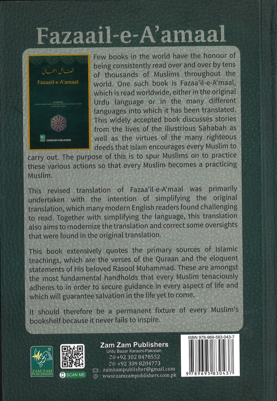 The Book Fazaa’il-e-Aamaal a vast treasure of fundamental Islamic teachings put together with great efforts by Hadhrat Sheikhul Hadith, Maulana Muhammad Zakariyya Kaandhalwi (RA). It is among the most famous and well known Islamic books. Allah Ta’ala has granted this book great acceptance and popularity throughout the globe. It consists of chapters like Stories of the Sahabah, Virtues of Noble Qura’an, Virtues of Salaah, Virtues of Zikr, Virtues of Tabligh, Virtues of Ramadhaan and The Present Degeneration of the Muslim and It’s only Remedy By Maulana Ihtishaamul Hasan Kaandhalwi (RA). The book arouses in the reader, the fear of Allah and a fervent desire to mould one’s life according to the Islamic Teachings. Thousands of people read this book and benefit from it. To date it has been translated into more than a dozen languages. This is a revised English translation with references by Mufti Afzal Hoosen Elias.