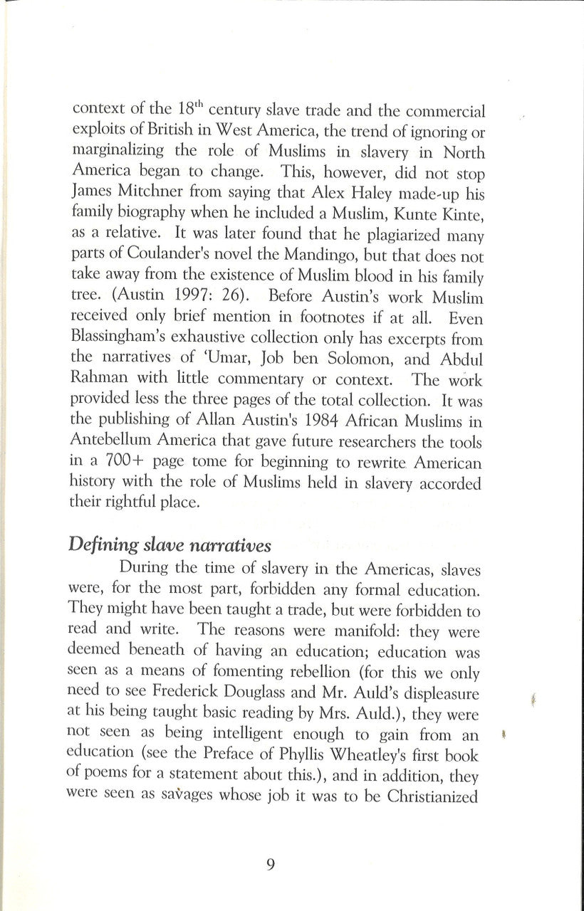 The presentation of Africa, Islam and slavery in the American slave Narratives of Muslim slaves in the Americas is a topic that is often overlooked in discussing the genre of slave narratives and the birth of African American Literature. In fact the first biography was that of a former Maryland slave, Job Ben Solomon, published in 1730 in Britain. By reexamining these often overlooked narratives we can get insight into African Islam, the turmoil of integration into a foreign culture, life in Africa, and life as a slave in the Americas. The primary sources include: the narrative of Job ben Solomon, the two autobiographical pieces of Muhammad Said of Bornu, the Arabic autobiography of 'Umar ibn Said, the Jamaican narrative of Abu Bakr Said, a discussion of coverage on Bilali Muhammad's excerpts from the Risalah of Abi Zaid, Theodore Dwight's articles on the teaching methods of the Serachule teacher slave Lamen Kebe, and a letter describing Salih Bilali.