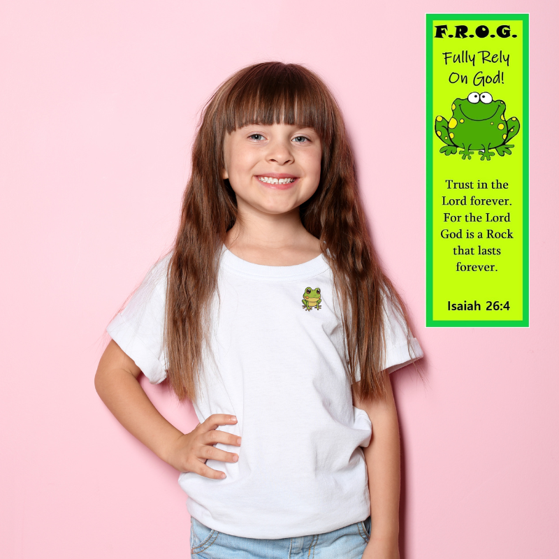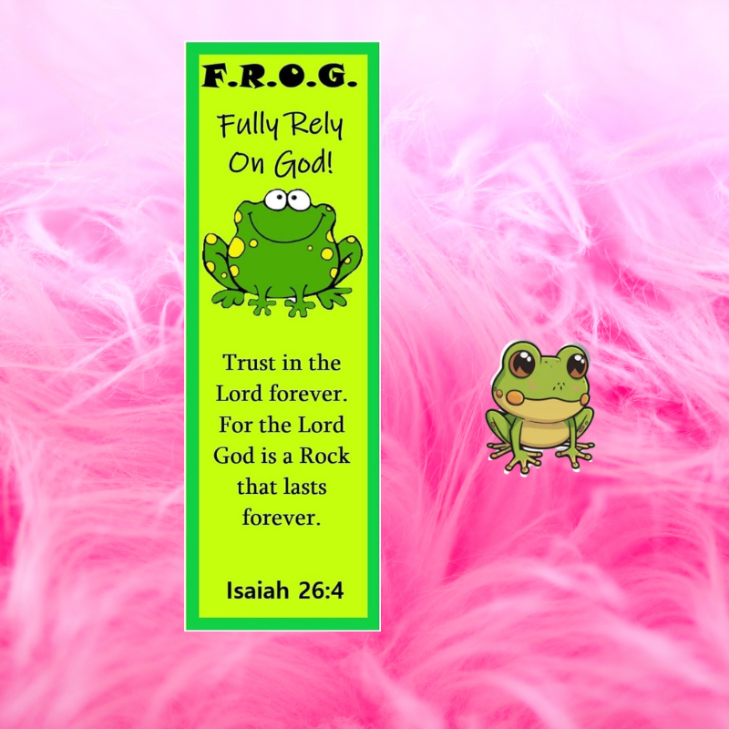 Each bookmark bears the uplifting message 'Fully Rely On God,' accompanied by an adorable frog illustration and the acronym F.R.O.G. The profound Bible verse Isaiah 26:4 is prominently displayed on the front, and for an extra touch, the verse is beautifully inscribed on the back.