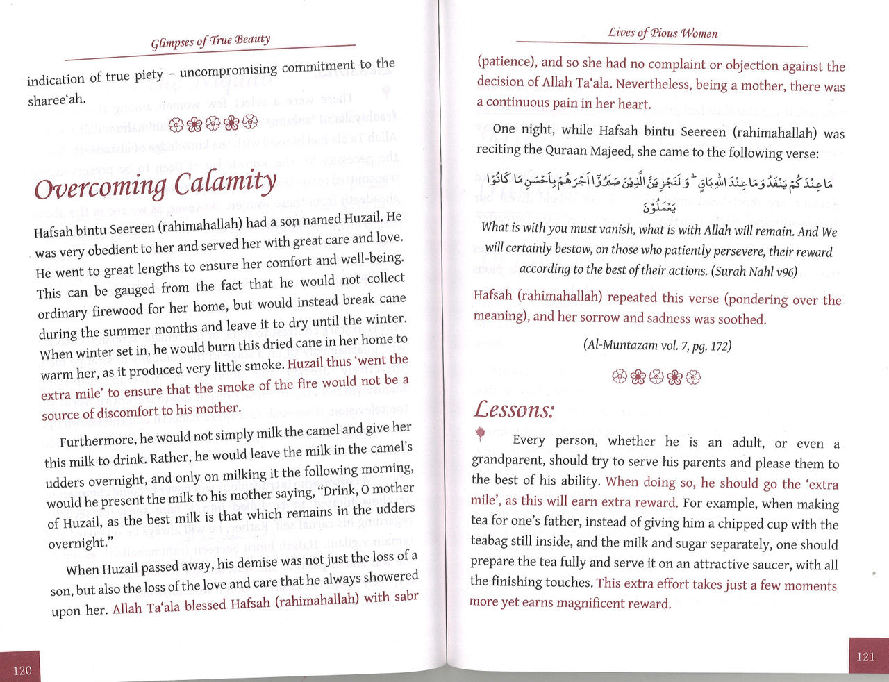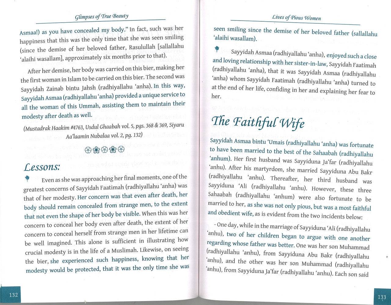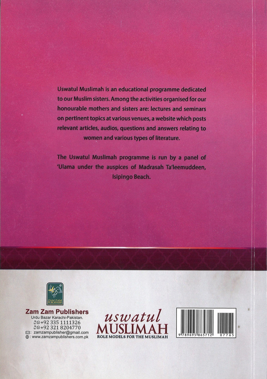 Throughout the centuries, the Muslim Ummah has always been blessed with phenomenal women who were the saints of their time. These unique women were blessed with such outstanding qualities that their lives continue to serve as inspiration and guidance for us all. Filled with incidents of such women, this compilation gives us a glimpse into their lives and highlights the true beauty which they possessed – the beauty of the soul.