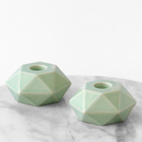 Pair of geometric candlesticks designed in modern style. These candle holders made of ceramic with light green glaze. Holds standard 0.8'' Shabbat candles or tea lights.