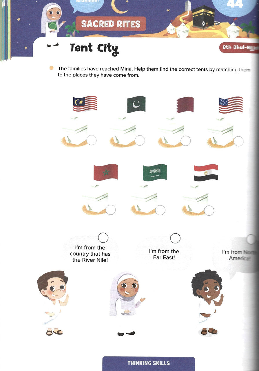 This incredible book uses fun activities to introduce, intrigue and advance learning about the key topics of Hajj and Umrah in a child’s modern environment. But most of all, your child will be left reeling with excitement about Hajj. Here’s how: