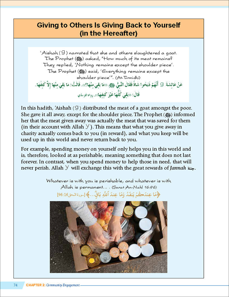 Level 1 presents topics suitable for the age group of 11 and above. The first unit, Social Health, deals with topics of navigating healthy relationships between Muslims, parents and children, and with non-Muslims. It also provides a road map for integrating youth with community engagement including helping those in need, understanding disabilities, and taking care of the environment. The second unit, Physical Health, connects healthy eating and exercise with verses from the Quran and ahadith as well as preventive measures of common lifestyle diseases.