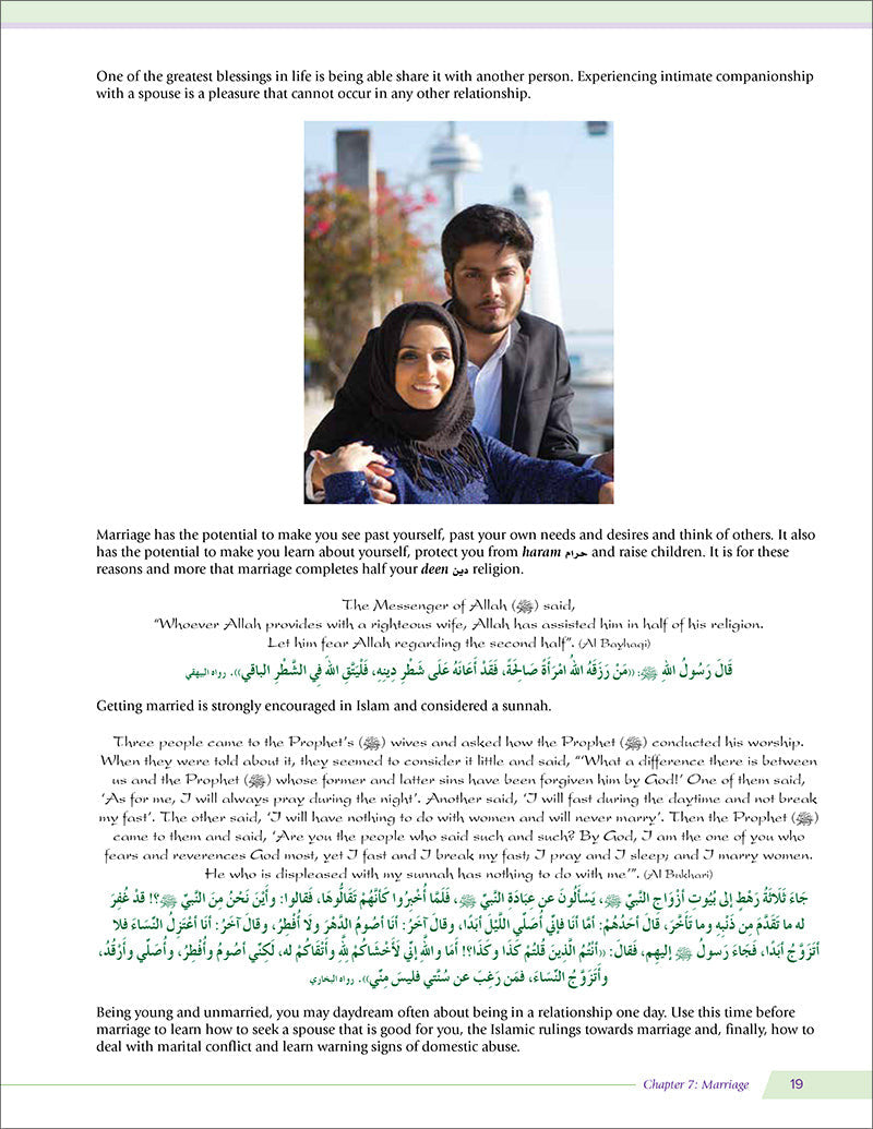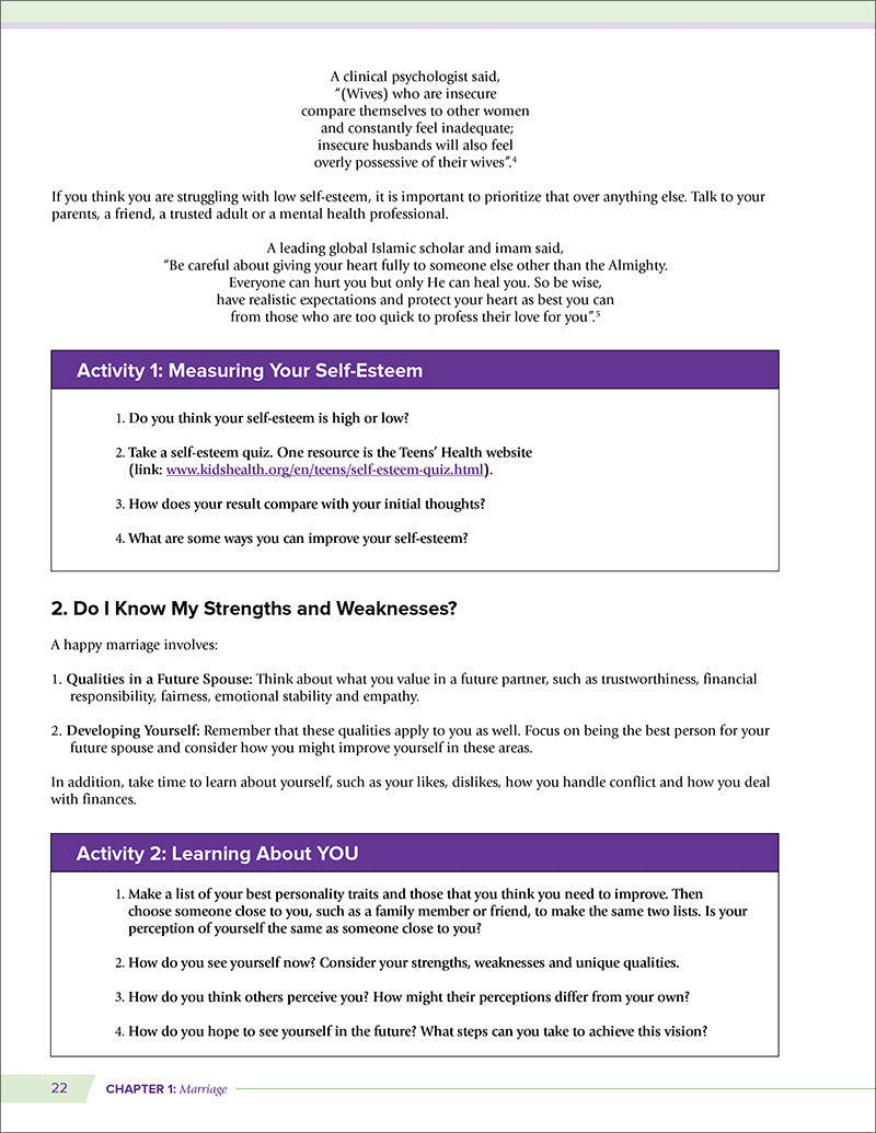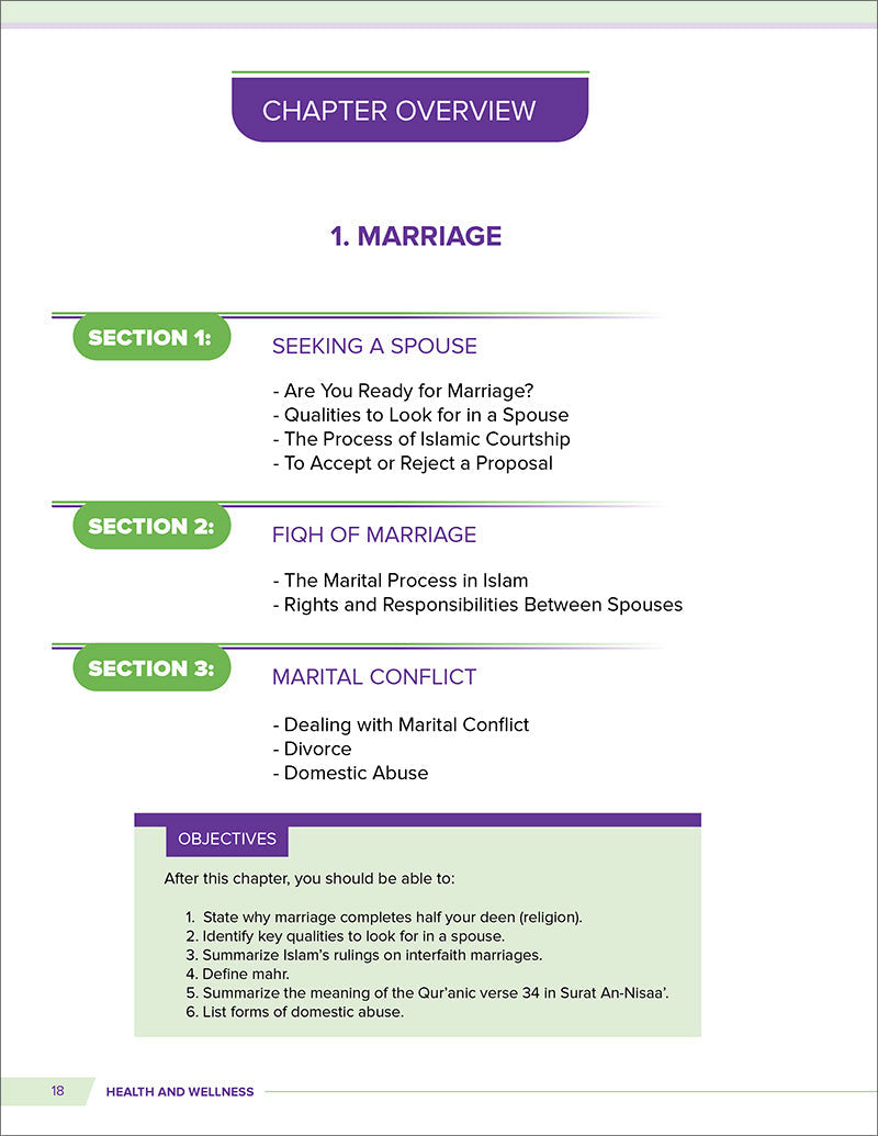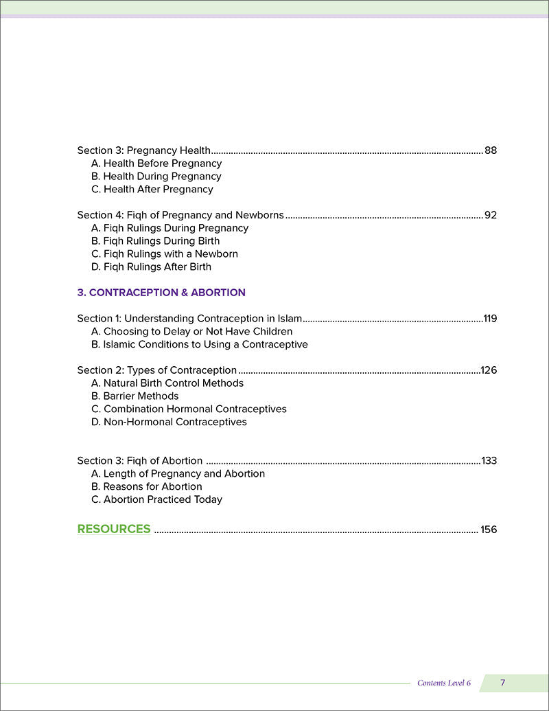 Level 6 presents topics designed for students aged 14 years and older. The Sexual Health Unit delves further into the topic of marriage and its related matters in Islam. It explores the methods for establishing a robust and healthy relationship between spouses, commencing with Islamic marriage etiquette and concluding with discussions on marital rights, marital conflict, pregnancy, contraception, and abortion, in addition to many health issues related to these topics.