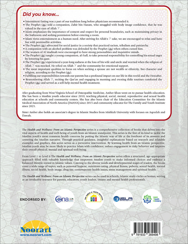 Have you ever considered how to nurture your student's or child's faith in Islam through a health education curriculum? This series delves into the wisdom underlying Islamic practices and beliefs, showcasing how they are precisely formulated by the One, all-wise and all-knowing Creator. Since this book falls within the category of health education, it addresses important health topics while adopting an Islamic perspective. These topics are presented with a focus on their relevance, engaging pedagogy, and age-appropriateness.