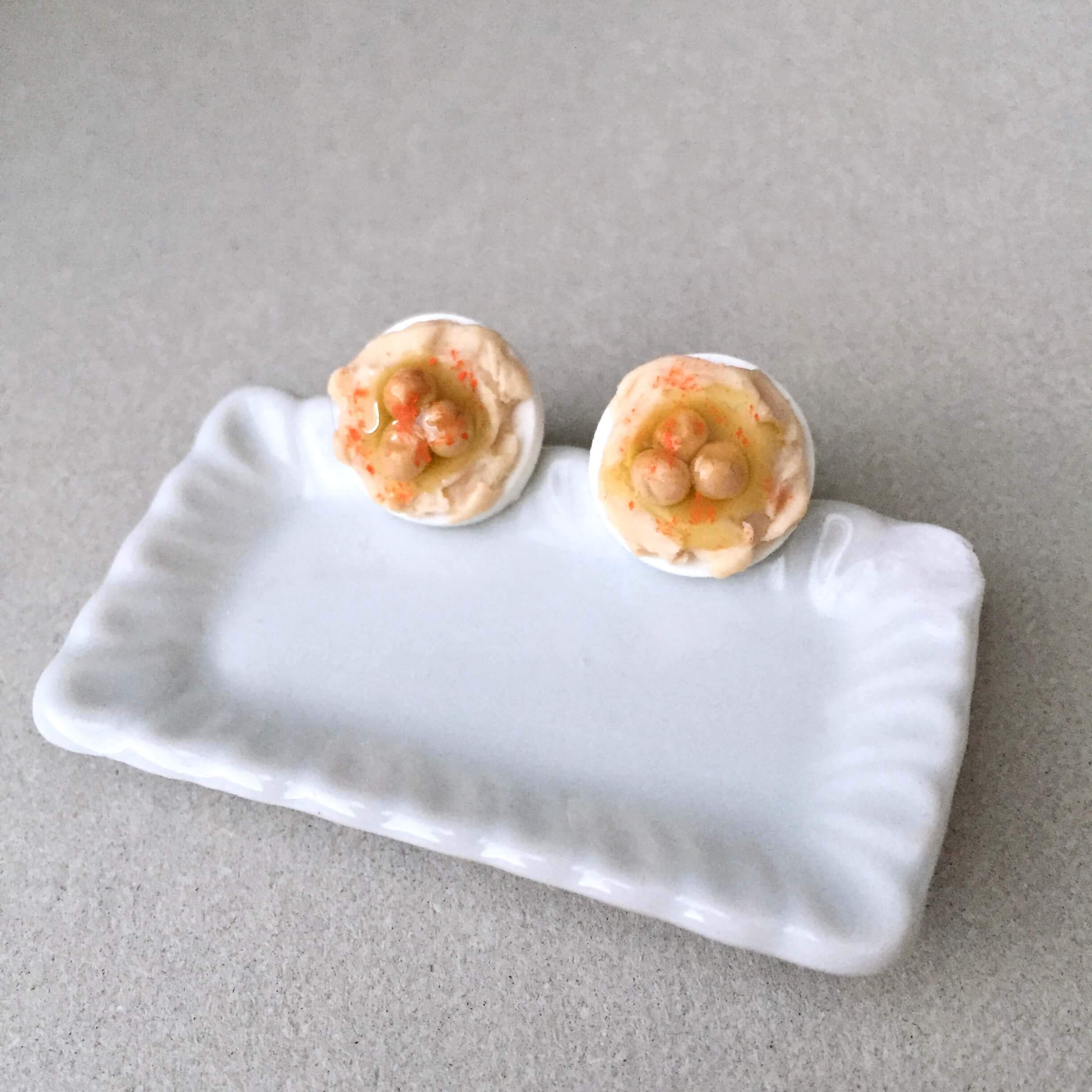 - Hand-sculpted from polymer clay, featuring realistic details and textures like an olive oil drizzle, chickpeas and paprika garnish.