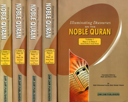 A translation of the nine volume exegesis of the Holy Quran, 'Tafsir Anwarul Bayan' originally published in Urdu, by Mufti Muhammad Ashiq Illahi Bulandshahri Muhajir Madani (1924-2001). Translation by Mufti Afzal Hoosen Elias. Major features of this Tafsir are that it provides: simple and easy to understand language, complete explanation including virtues of each surah, theme of the surah, references from hadith, statements of the Sahabah.