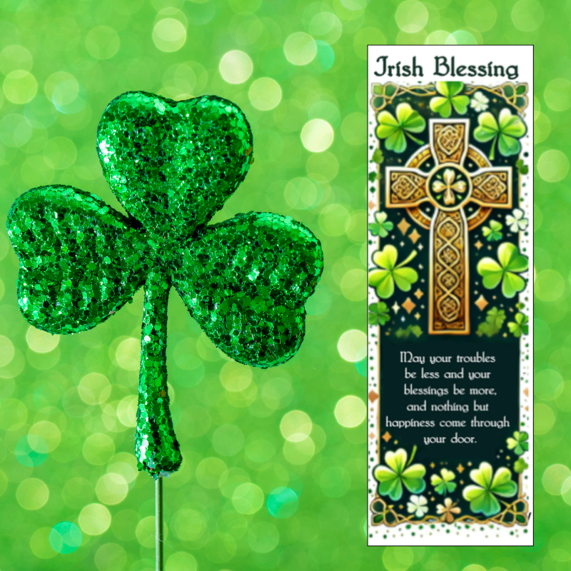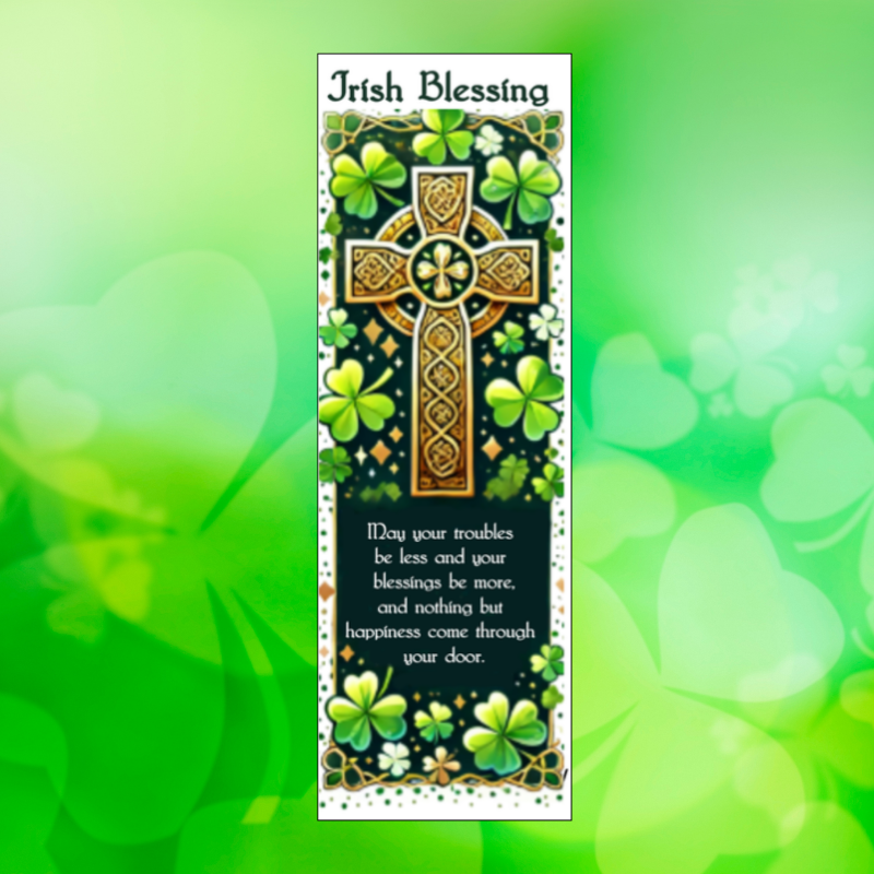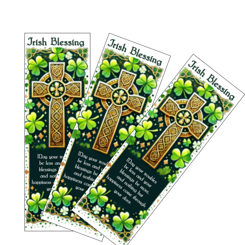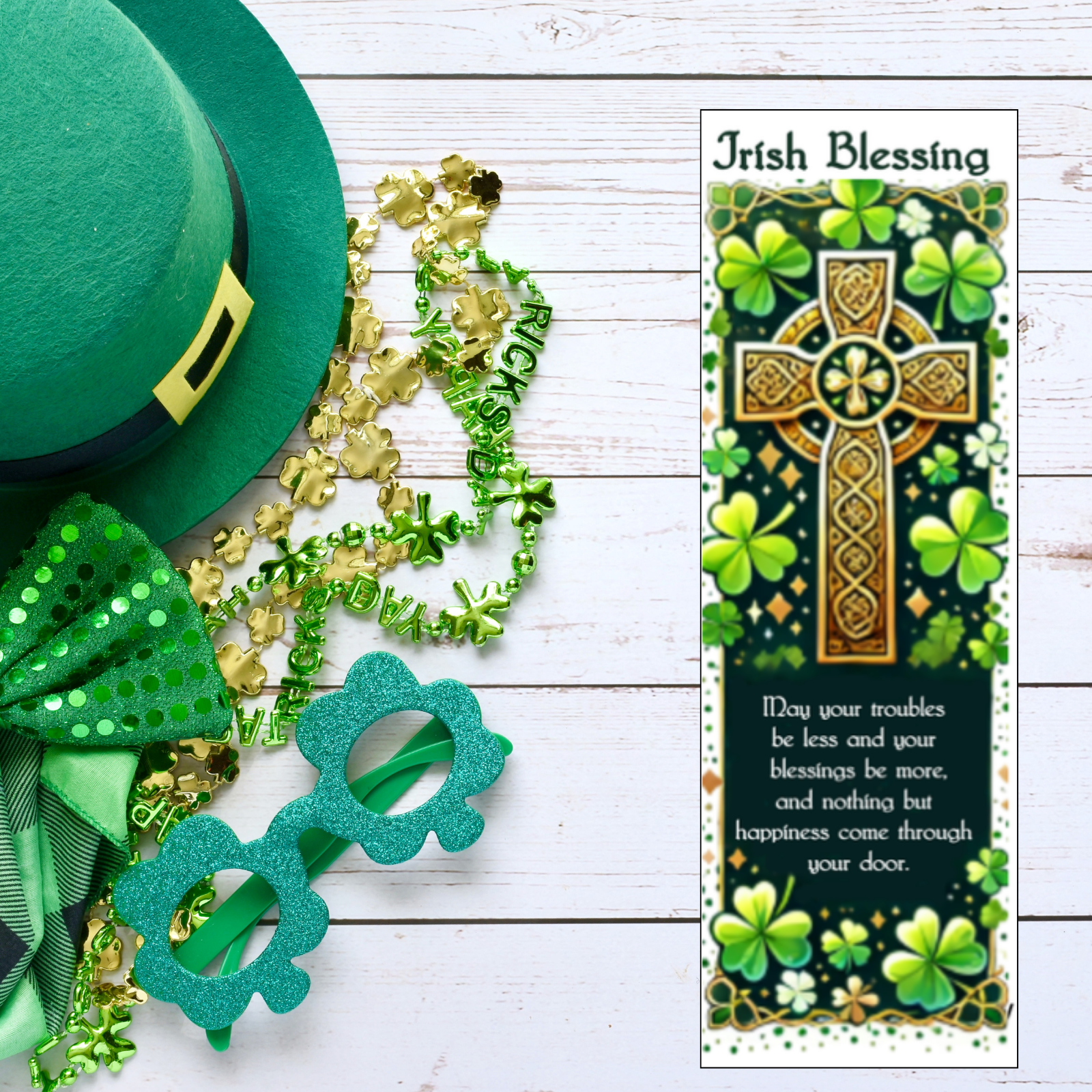 Irish Blessing Shamrock bookmarks are great to hand out at church or your next Happy St. Patrick's Day events. You get 100 Irish Blessing shamrock bookmarks. Each one says, May your troubles be less and your blessings be more and nothing but happiness come through the door. These bookmarks are green in color and have clovers, shamrocks on them. 6' by 2' in size.