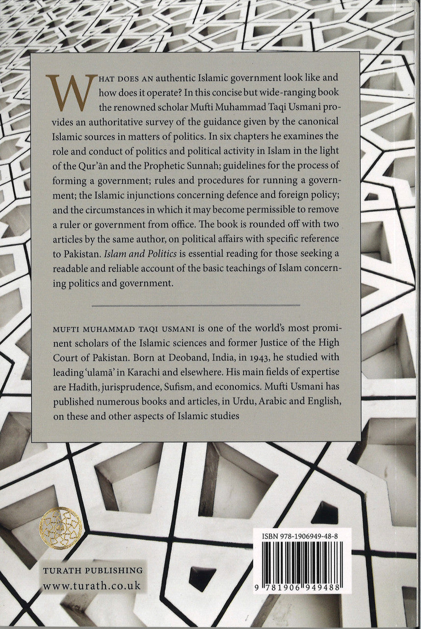 What does an authentic Islamic government look like and how does it operate? In this concise but wide-ranging book the renowned scholar Mufti Muhammad Taqi Usmani provides an authoritative survey of the guidance given by the canonical Islamic sources in matters of politics. In six chapters he examines: the role and conduct of politics and political activity in Islam in the light of the Qur'an and the Prophetic Sunnah; the Islamic concept of government; guidelines for the process of forming a government; rules and procedures for running a government; the Islamic injunctions concerning defence and foreign policy; and the circumstances in which it may become permissible to remove a ruler or government from office. The book is rounded off with two articles by the same author, on political affairs with specific reference to Pakistan. Islam and Politics is essential reading for those seeking a readable and reliable account of the basic teachings of Islam concerning politics and government. Appendices The Constitution What is meant by an Islamic constitution? The Islamic clauses of the constitution. Basic principles of an Islamic state. Establishing a fair economic system