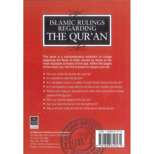 Islamic Rulings Regarding the Qur'an Fatawa from the Permanent Committee of Scholars, Saudi Arabia This book is a comprehensive collection of rulings regarding the Book of Allah, issued by some of the most reputable scholars of this age. Within the pages of this book you will find answers to issues such as: - Can you recite the Quran as a group? - Is it allowed to kiss the Quran? - Is it necessary to be in a state of wudu whilst reciting the Quran? - Is it permissible to pray behind someone who recites incorrectly? - What is the ruling on decorating the walls with posters that contain verses of the Quran? - Can you recycle pages of the Quran? - Can you take the Quran into the bathroom? - May a woman recite the Quran while she is menstruating?