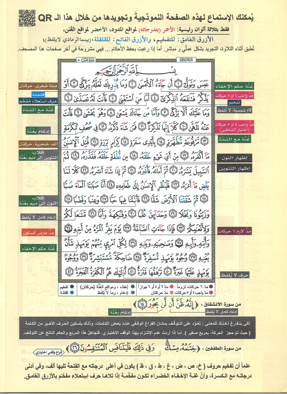 - Color coded letters: to present the Tajweed rules, very good and simple way to learn and apply Tajweed rules.