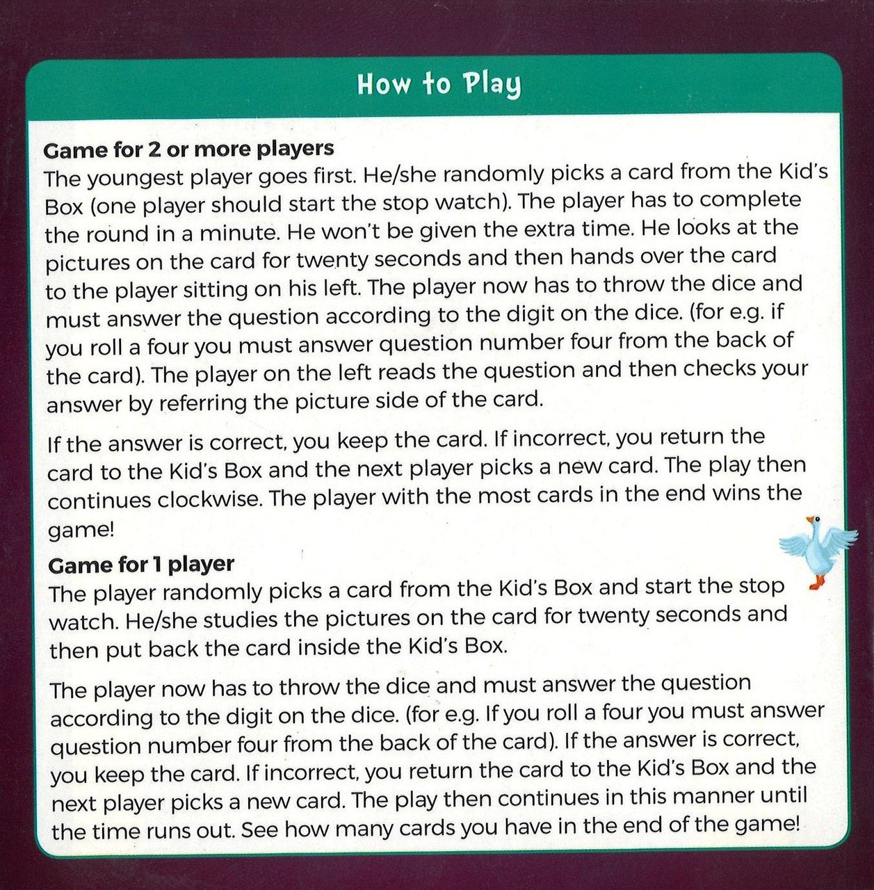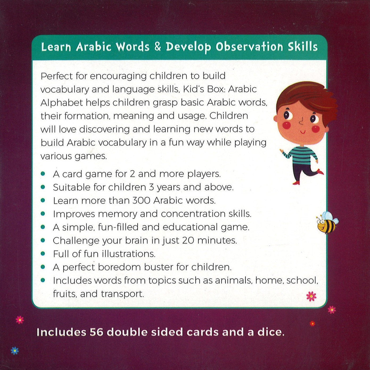 Learn Arabic Words & Develop Observation Skills Perfect for encouraging children to build vocabulary and language skills, Kid’s Box: Arabic Alphabet helps children grasp basic Arabic words, their formation, meaning and usage. Children will love discovering and learning new words to build Arabic vocabulary in a fun way while playing various games. A card game for 2 and more players Suitable for children 3 years and above Learn more than 300 Arabic words Improves memory and concentration skills A simple, fun-filled and educational game Challenge your brain in just 15 minutes Full of fun illustrations A perfect boredom buster for children Includes words from topics such as animals, home, school, fruits, and transport. Includes 56 double sided cards and a dice.