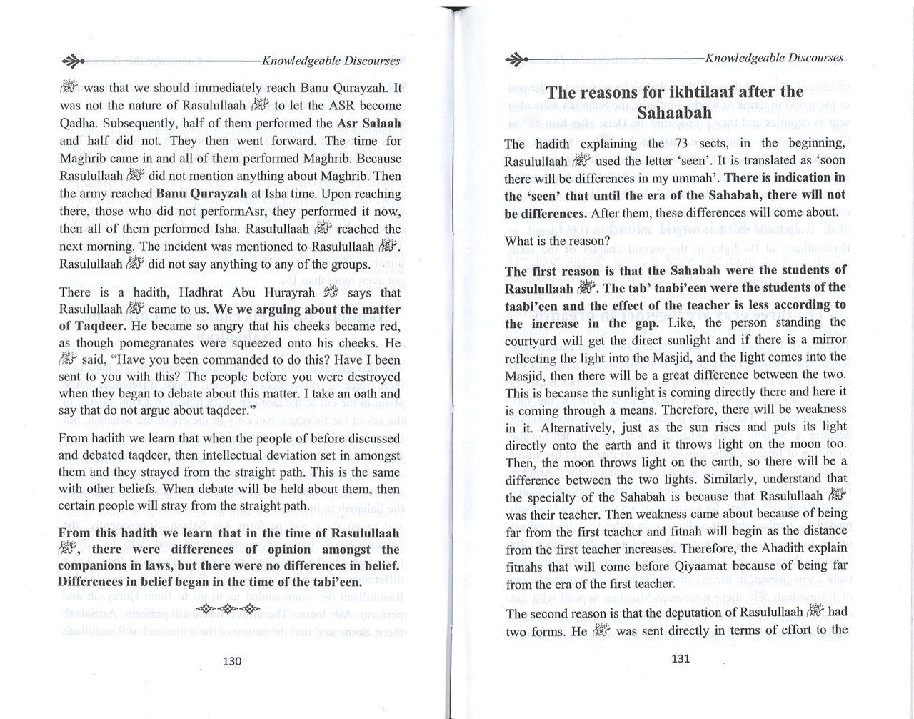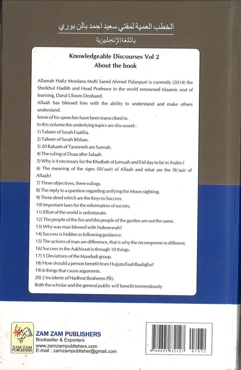 Allamah Hafiz Moulana Mufti Saeed Ahmed Palanpuri is currently (2014) the Sheikhul Hadith and Head Professor in the world renowned Islaamic seat of learning, Darul Uloom Deoband. Allaah has blessed him with the ability to understand and make others. understand. Some of his speeches have been transcribed in. In this volume the underlying topics are discussed:- 1) Tafseer of Surah Faatiha. 2) Tafseer of Surah Ikhlaas. 3) 20 Rakaats of Taraweeh are Sunnah. 4) The ruling of Duaa after Salaah. 5) Why is it necessary for the Khutbah of Jumuah and Eid day to be in Arabic? 6) The meaning of the signs (Sh’aair) of Allaah and what are the Sh’aair of Allaah? 7) Three objectives, three rulings. 8) The reply to a question regarding unifying the Moon sighting. 9) Three deed which are the Keys to Success. 10) Important laws for the reformation of society. 11) Effort of the world is unfortunate. 12) The people of the fire and the people of the garden are not the same. 13) Why was man blessed with Nabuwwah? 14) Success is hidden in following guidance. 15) The actions of man are difference, that is why the recompense in different. 16) Success in the Aakhiraat is through 10 things. 17) 5 Deviations of the Maududi group. 18) How should a person benefit from HujjatullaahBaaligha? 19) 6 things that cause arguments. 20) 2 Incidents of Hadhrat Ibraheem (4). Both the scholar and the general public will benefit tremendously