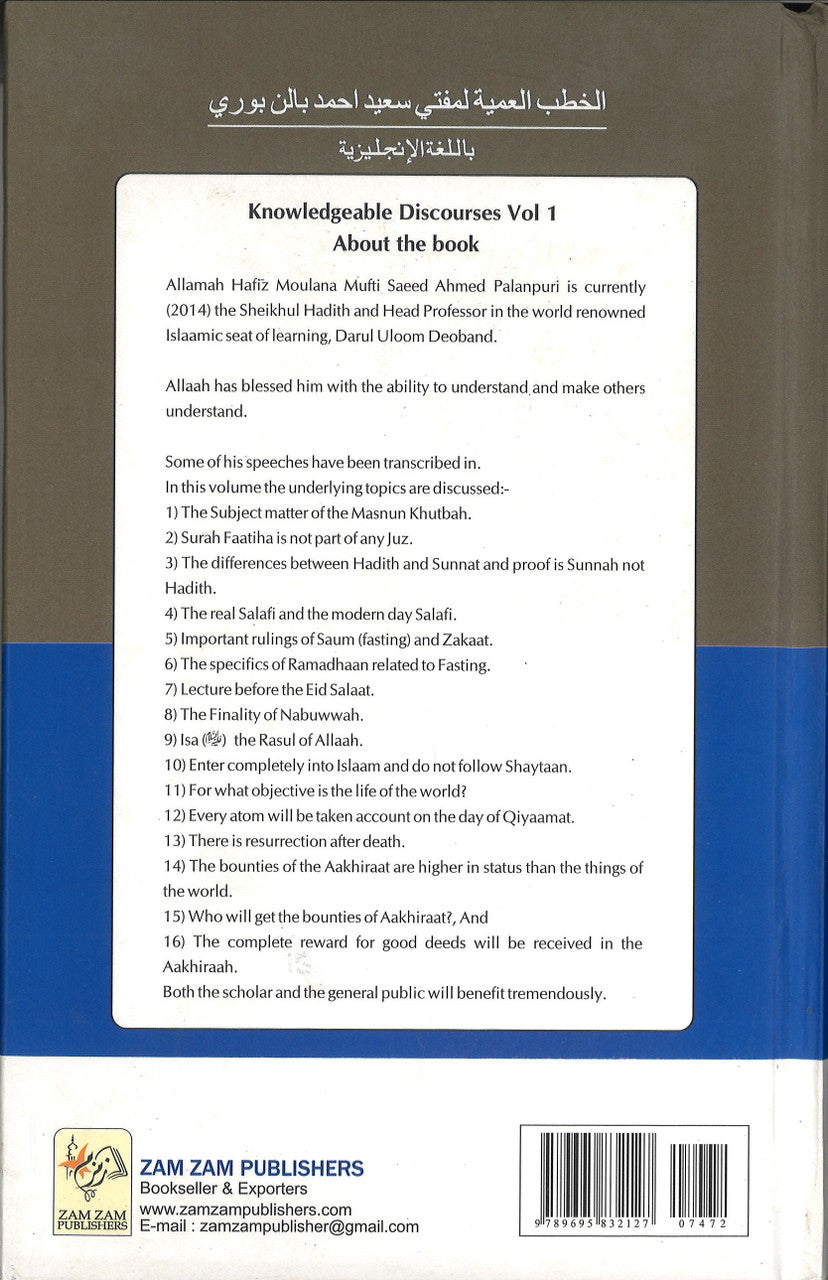 Allamah Hafiz Moulana Mufti Saeed Ahmed Palanpuri is currently (2014) the Sheikhul Hadith and Head Professor in the world renowned Islaamic seat of learning, Darul Uloom Deoband. Allaah has blessed him with the ability to understand and make others understand. Some of his speeches have been transcribed in. In this volume the underlying topics are discussed:- 1) The Subject matter of the Masnun Khutbah. 2) Surah Faatiha is not part of any Juz. 3) The differences between Hadith and Sunnat and proof is Sunnah not Hadith. 4) The real Salafi and the modern day Salafi. 5) Important rulings of Saum (fasting) and Zakaat. 6) The specifics of Ramadhaan related to Fasting. 7) Lecture before the Eid Salaat. 8) The Finality of Nabuwwah. 9) Isa (2) the Rasul of Allaah. 10) Enter completely into Islaam and do not follow Shaytaan. 11) For what objective is the life of the world? 12) Every atom will be taken account on the day of Qiyaamat. 13) There is resurrection after death. 14) The bounties of the Aakhiraat are higher in status than the things of the world. 15) Who will get the bounties of Aakhiraat?, And 16) The complete reward for good deeds will be received in the Aakhiraah. Both the scholar and the general public will benefit tremendously.