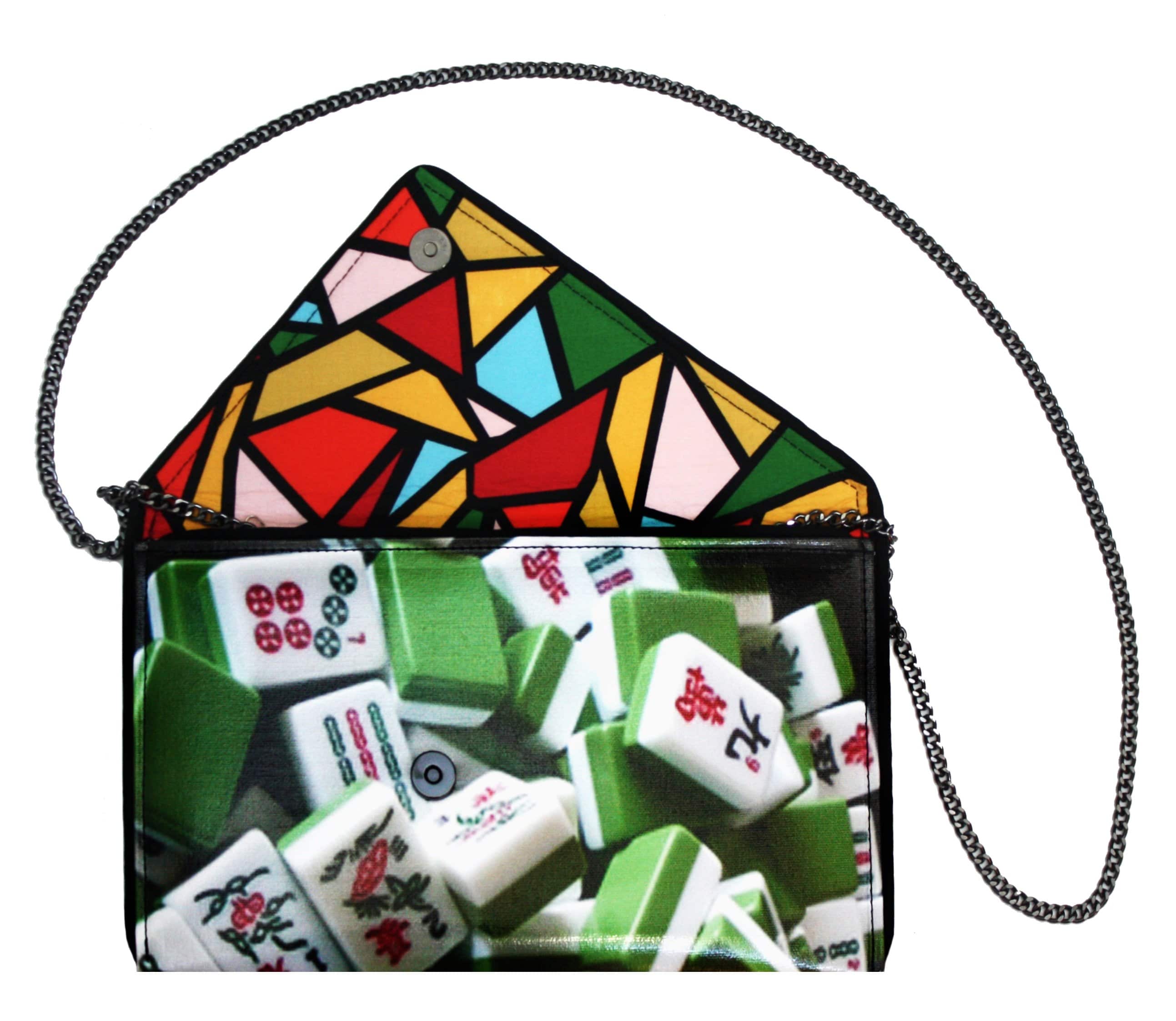 Gorgeous asymmetrical clutch featuring a playful Mah jongg set. Features 3D attachment. Cruelty-free, made from luxury quality coated canvas. All bags come with a removable cross-body chain, logo dust bag, clear vinyl inner pocket, and are individually signed. Inside fabric may differ from what is pictured. Inside material may vary.