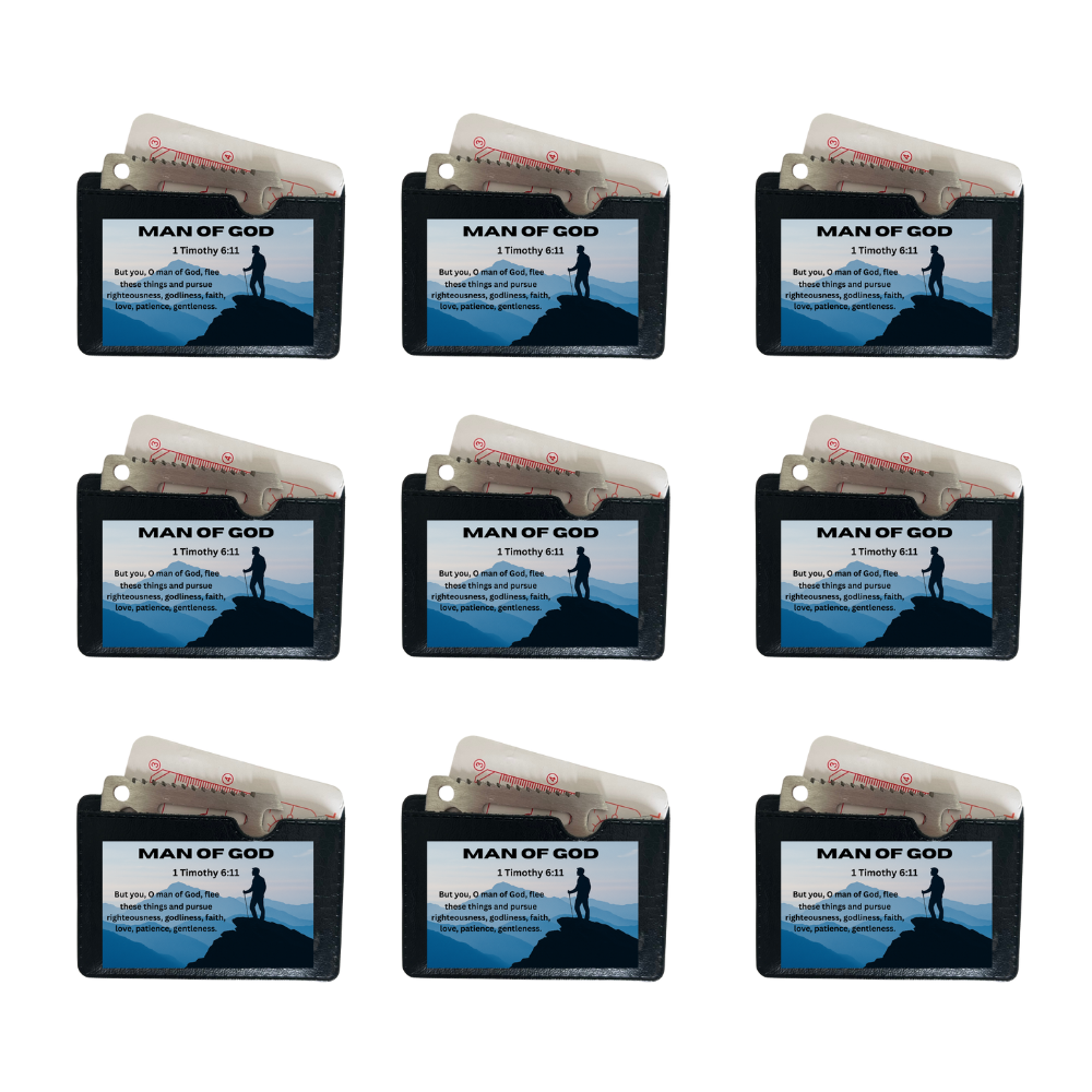 Equip the men in your church with a powerful symbol of faith and utility! This 10-pack of “Man of God” Stainless Steel Credit Card Multitools is a compact yet mighty survival tool designed for everyday carry. Each card is laser-engraved with 1 Timothy 6:11 — 'But you, O man of God, flee these things and pursue righteousness, godliness, faith, love, patience, gentleness' — making it a perfect Father’s Day gift or men's ministry handout.