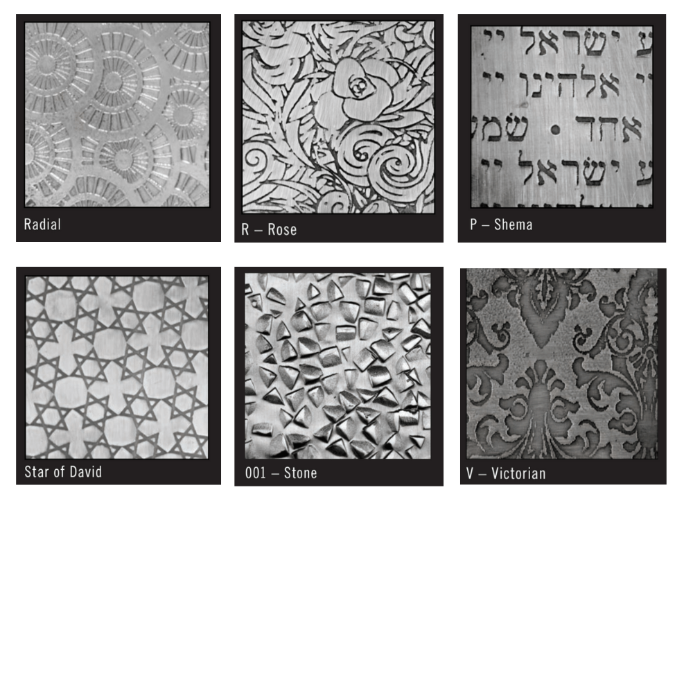 Available in Alef Bet, Baby, Deco, I Am My Beloved, Large Pebble, Patchwork, Radial, Rose, Shema (shown), Star of David, Stone, Victorian