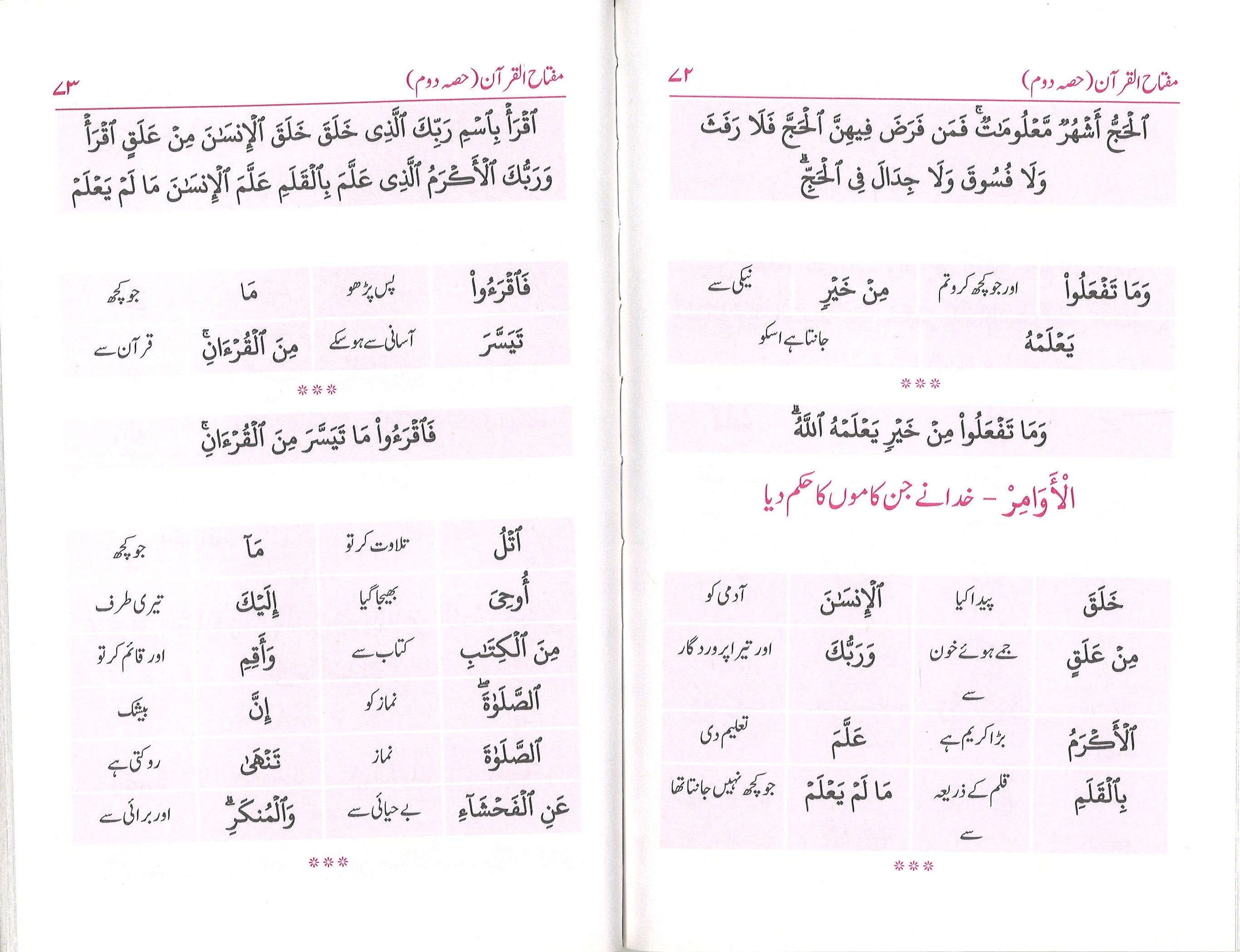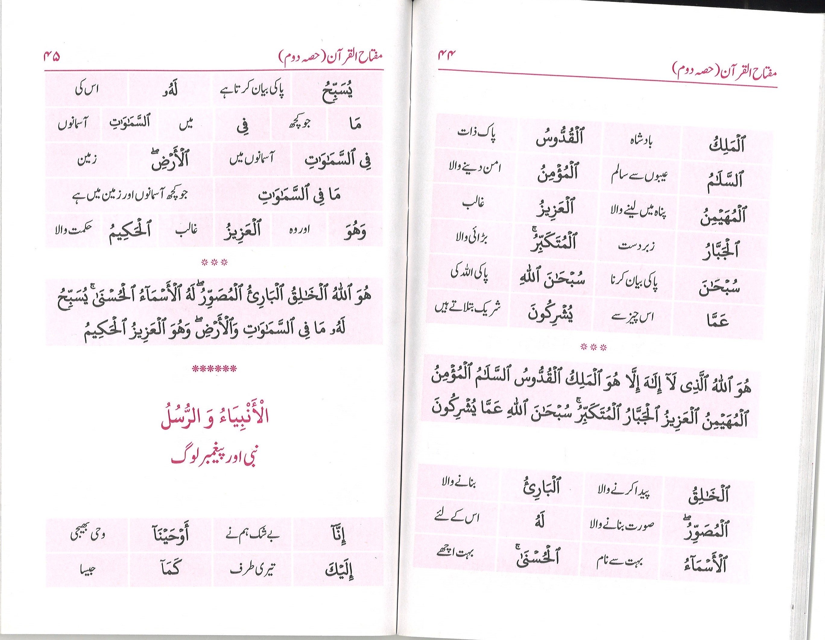 Miftah ul Quran is a beginner's book in understanding the Arabic Qur'an without learning grammar. The reader will benefit significantly due to its systematic approach and hence it is taught in numerous academic institutes across the world.