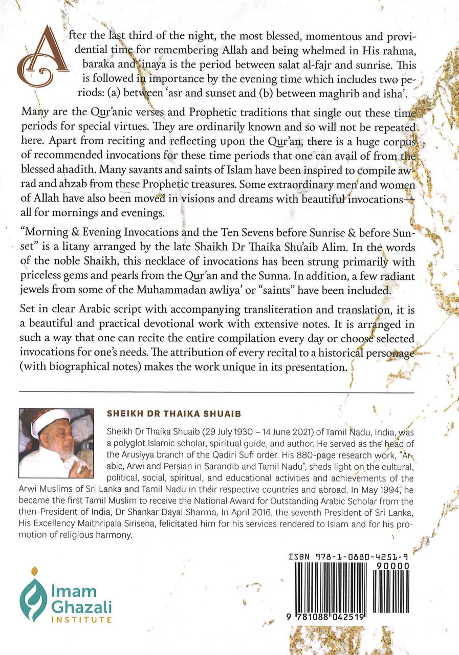 'Morning & Evening Invocations and the Ten Sevens before Sunrise & before Sunset” is a litany arranged by the late Shaikh Dr Thaika Shu’aib Alim. In the words of the noble Shaikh, this necklace of invocations has been strung primarily with priceless gems and pearls from the Qur’an and the Sunna. In addition, a few radiant jewels from some of the Muhammadan awliya’ or “saints” have been included.