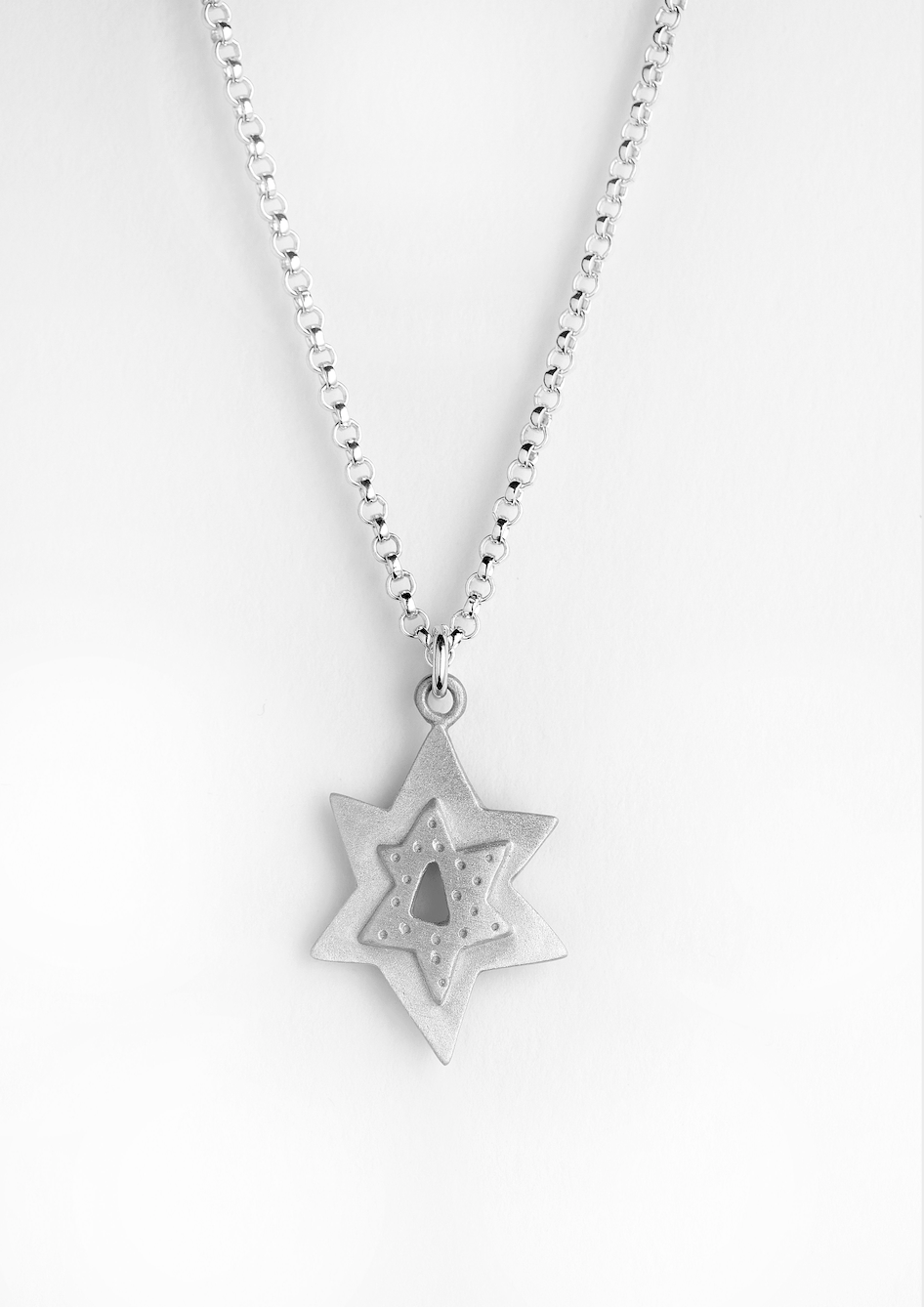A special gift for mother and daughter... Both necklaces are handmade in the USA out of sterling silver. The daughter's Star of David Necklace measures 1/2' in diameter and is centered with a tear-drop design. The mother's Star of David Necklace measures 1' in diameter (is still dainty) with a star in the center. Both charms are double-sided and both hang on fine-gauge rolo chains. A special sentiment, for sure!