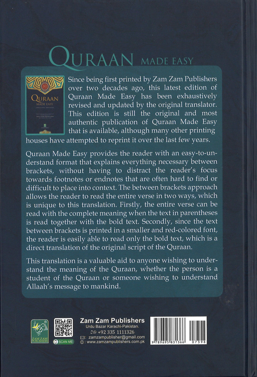 This is a translation of the Complete Quran in Contemporary English to make reading much easier and more understandable. The English translation follows each Arabic verse underneath in this version. It includes explanatory notes within the translation rather than separately in the footnotes. Each surah begins with a summary of the surah, including its topics and links with the previous surah.