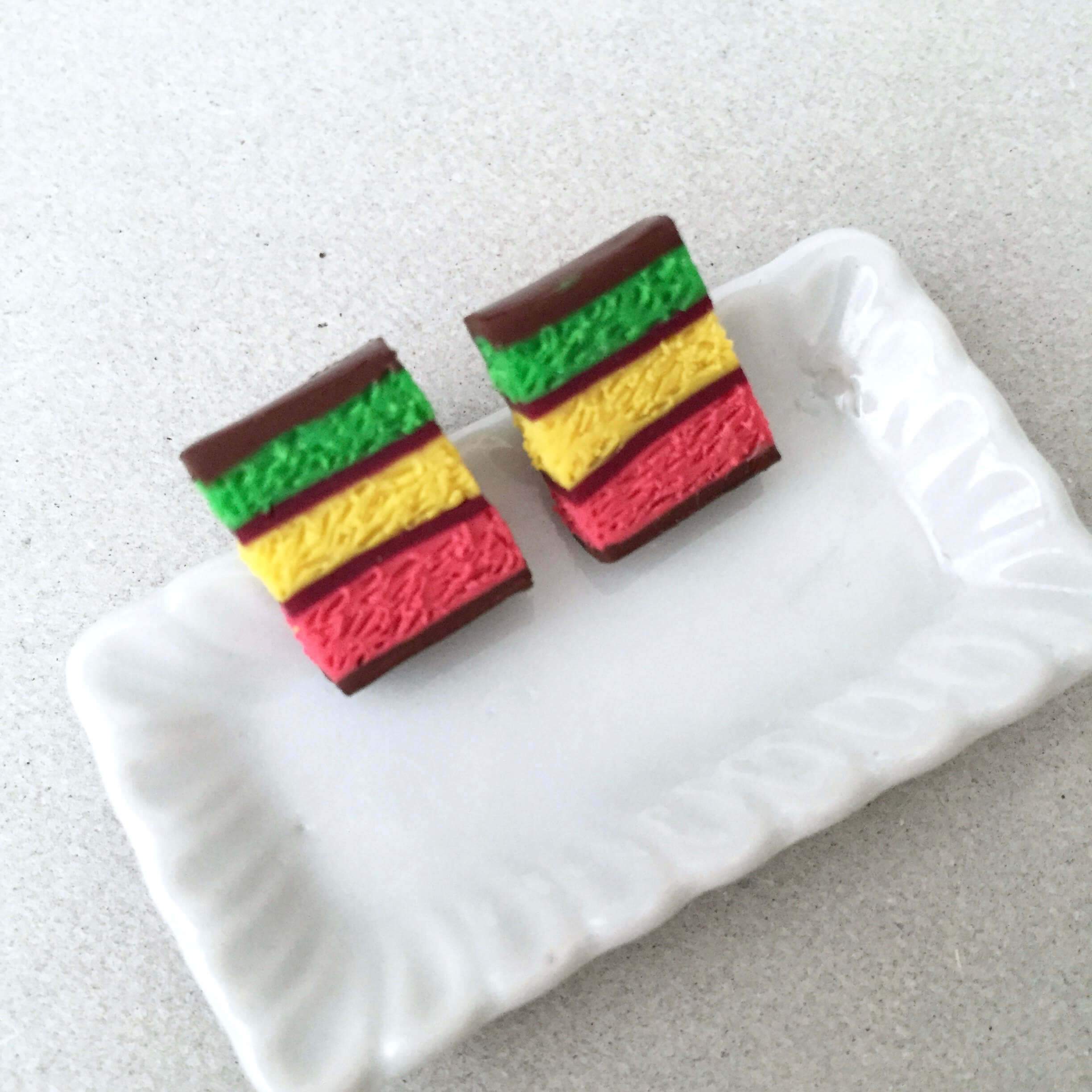 Whether you call ‘em “rainbow cakes” or “rainbow cookies” - these tricolor yummies are sure to spark warm fuzzy feelings of nostalgia. These stud earrings are hand-sculpted from polymer clay and feature realistic details like crumbly cake texture and jelly layers.