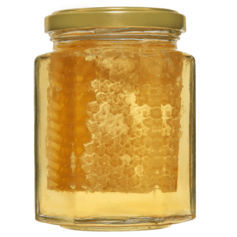 The Acacia Honeycomb Honey is sold in 12oz hexagonal jars.
