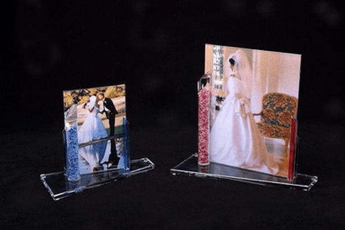 This contemporary Shardz Picture Frame will allow you to cherish your wedding memories forever. After you break your Shardz wedding glass beneath the chuppah, keep the shards! Artist Shardz will make them a part of this magnificent custom glass picture frame as a reminder of the day two wandering spirits merged into one. The color of the columns will match the color of your shards.