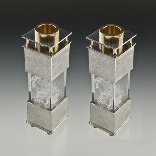 These beautiful Square Wedding Shards Candleholders by Joy Stember are a perfect gift for the newly married couple so they can place their own broken glass inside and remember that joyful moment under the chuppah, when the groom broke the glass and the guests all shouted 'Mazel Tov'. Here is an opportunity to create a family heirloom using their crushed shards. Made from pewter and acrylic. They come with two sets of interchangeable inserts, one fits shabbos candles and another that will fit a standard tapered candle.