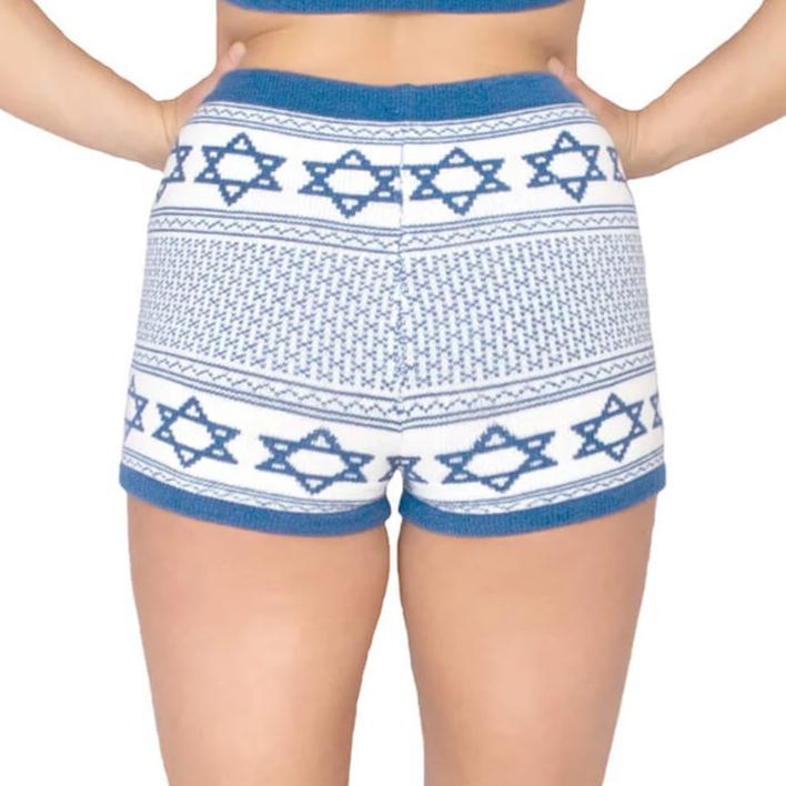 These cozy, sweater knit boy shorts are made from the softest yarns that are easy to care for and wearable year round. They are designed to wear as underwear, loungewear, sleepwear, to festivals, dance, and intimates. A fair isle pattern of the Star of David is knit throughout the piece with a contrasting color waistband. Perfect to wear on Hanukkah morn as you open all your presents from Hanukkah Harry! Or something like that.