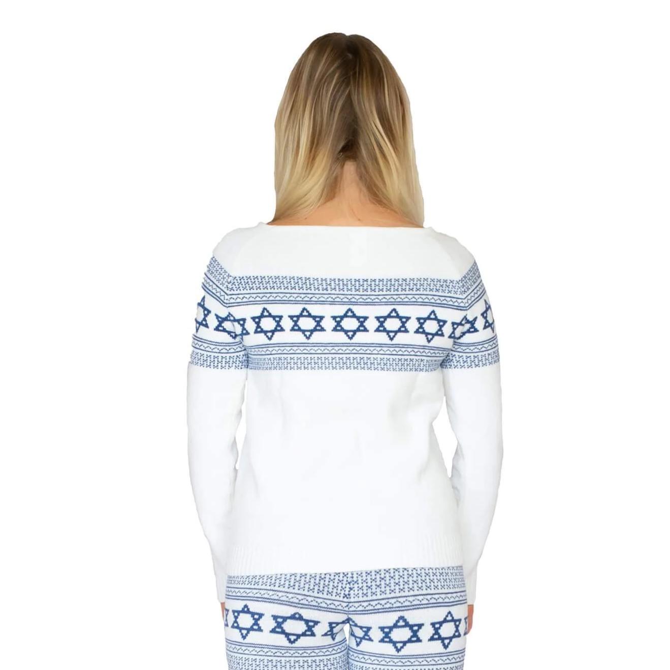 This cozy knit sweater is made from the softest yarns that are easy to care for and wearable year-round. Constructed with raglan sleeves and a boat neck style collar this is a sexy and comfortable fit. A fair isle pattern of the Star of David is knit throughout the upper body. Perfect to wear on Hanukkah morn as you open all your presents from Hanukkah Harry! Or something like that.
