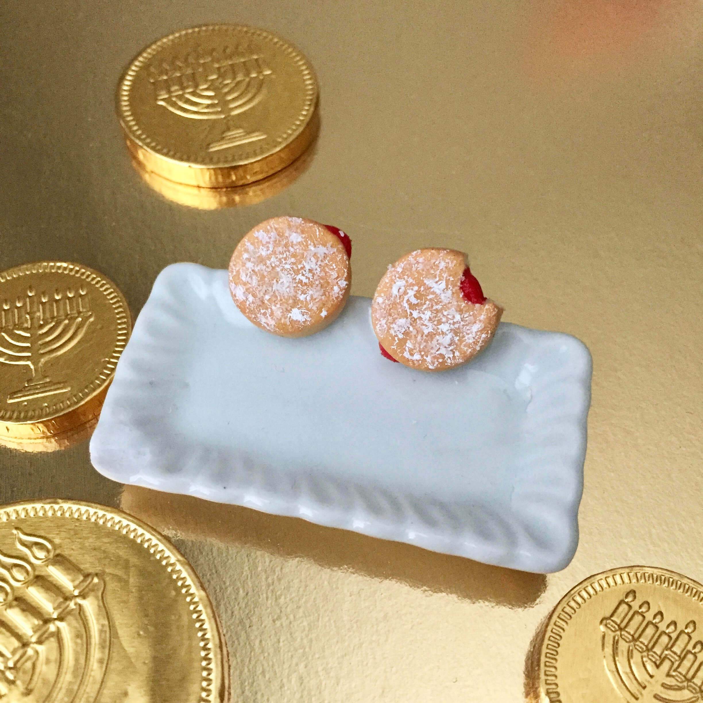 Little sufganiyot (Hanukkah jelly donuts) are hand-sculpted from polymer clay and feature realistic details like powdered sugar and oozing jelly.