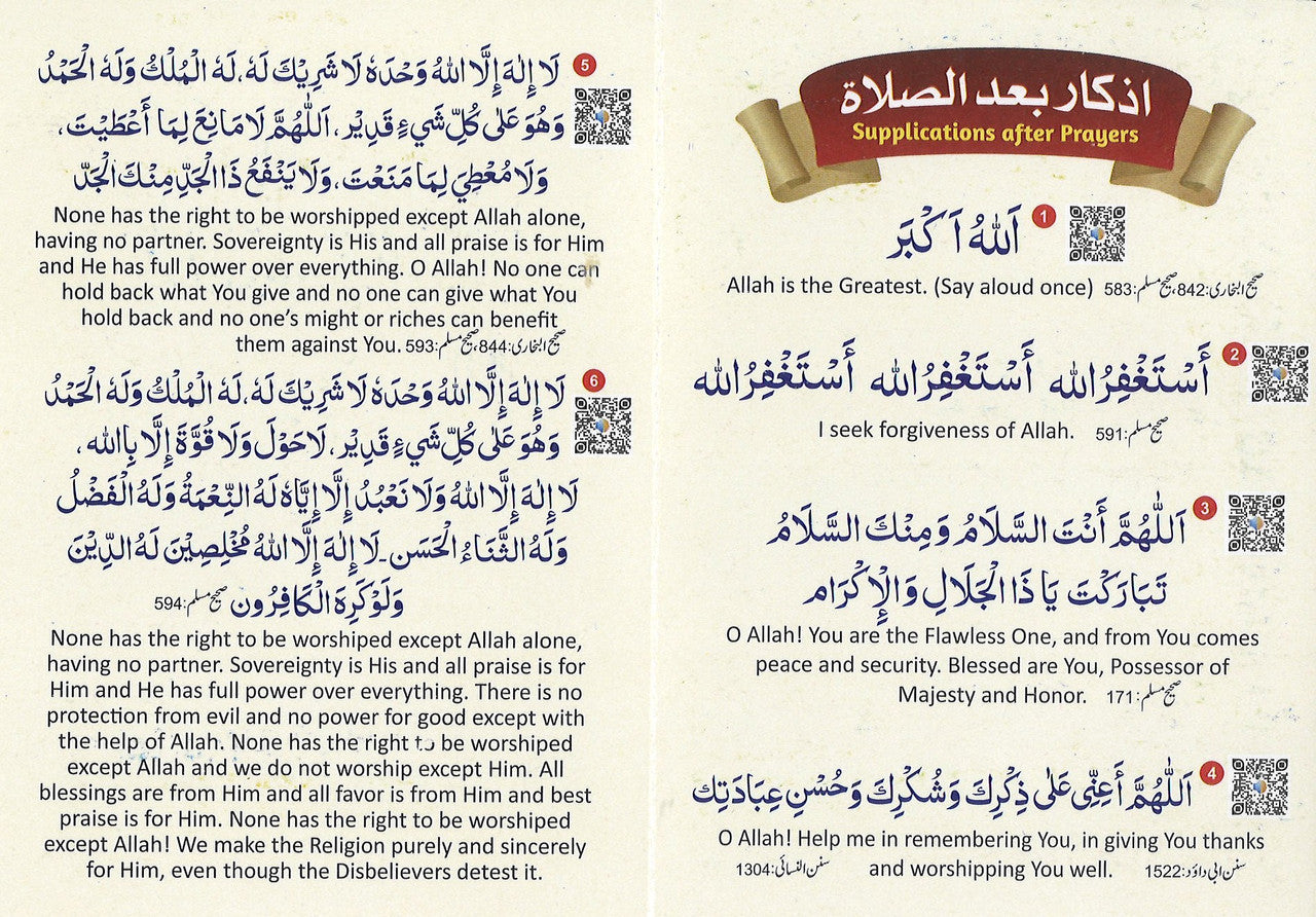 This small foldable card contains 8 authentic supplications / adhkar that you recite right after saying tasleem after the Fard (obligatory prayers). Each supplication/azkar is written in bold script Arabic along with the English translation and hadith reference. Additionally each dua has a QR code which you can scan on your phone to hear the Arabic dua for correct pronunciation. You can keep this card in your pocket to read the azkar after the prayers or memorize them.