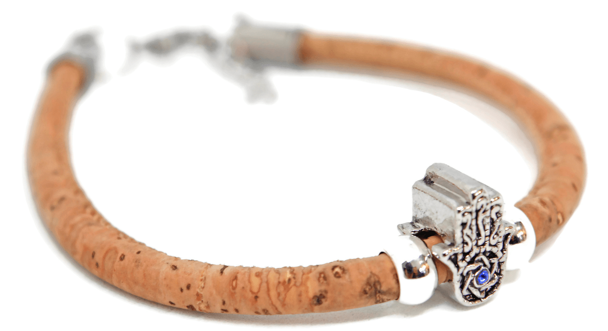 Woven Cork Bracelet with Swarovski Star. Natural cork is woven around a cotton core, with the protecting hamsa with blue Swarovski crystals. Perfect for gifting. Cork is imported directly from Portugal where it is sustainably harvested. Cork is incredibly durable, water resistant, and an eco-friendly, vegan alternative to leather. Plated metals.