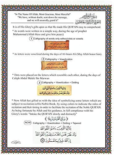 The reader will get used to reciting the Quran by using colors very easily. By engaging the eye, the reader will find him/herself applying 24 rules of Tajweed with ease and precision while his/her mind is left un-enganged to comprehend and understand the meaning of the holy Quran.
