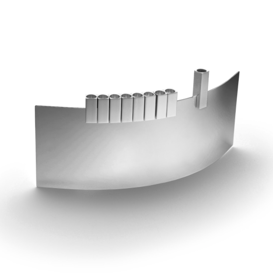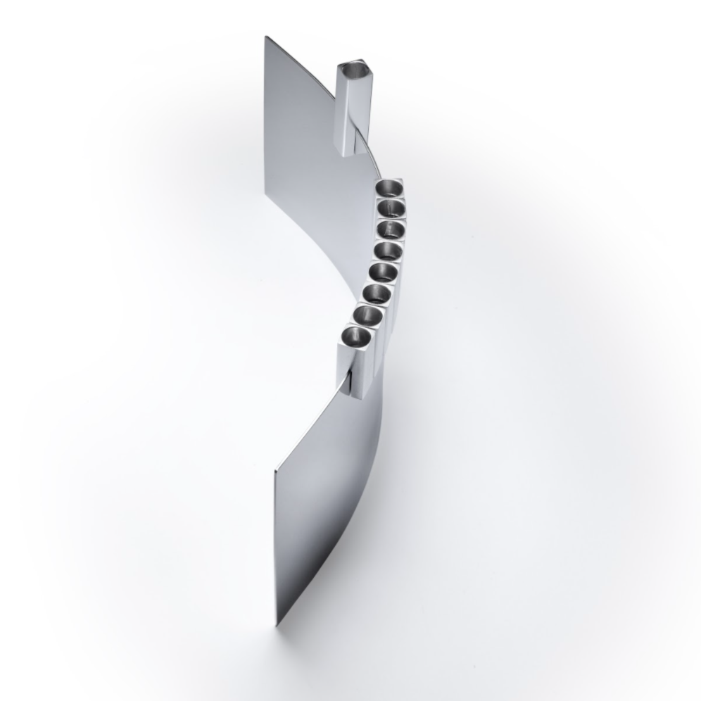 The steel base is created out of gently formed highly polished steel. The gloss anodized aluminum candle holders can be slotted wherever you wish on the top of the steel base and include neodyium magnets which attach to the base. Choose Magenta, Cobalt or Silver shamash.